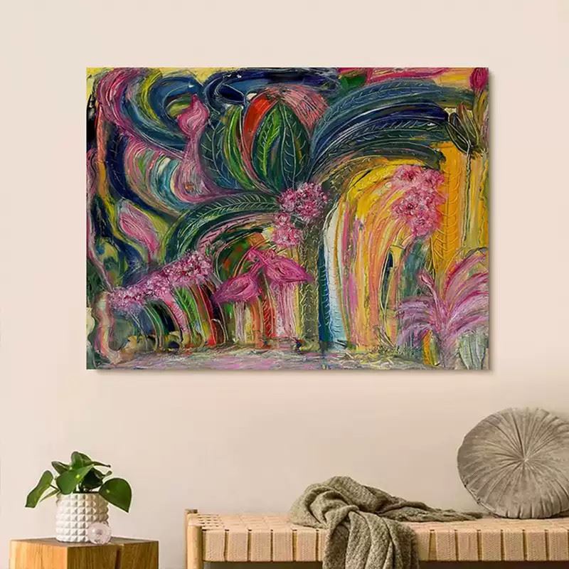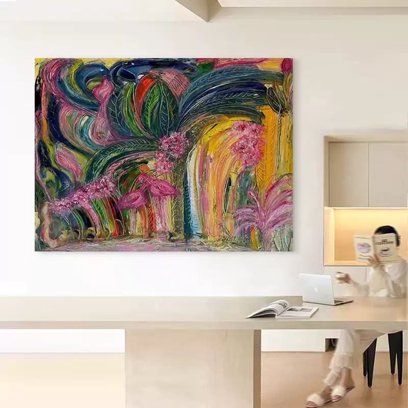 Curving leaves sweep across the scene while clusters of pink blossoms glow between them, like a vivid garden leading into another realm. Dimensions: 31 x 24 inches.