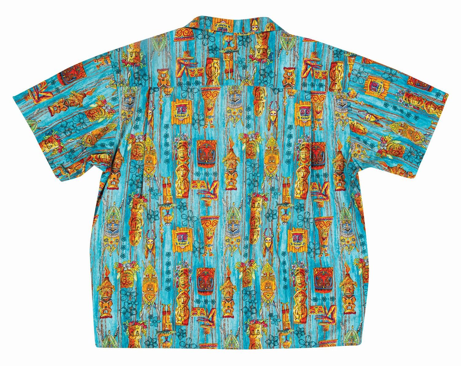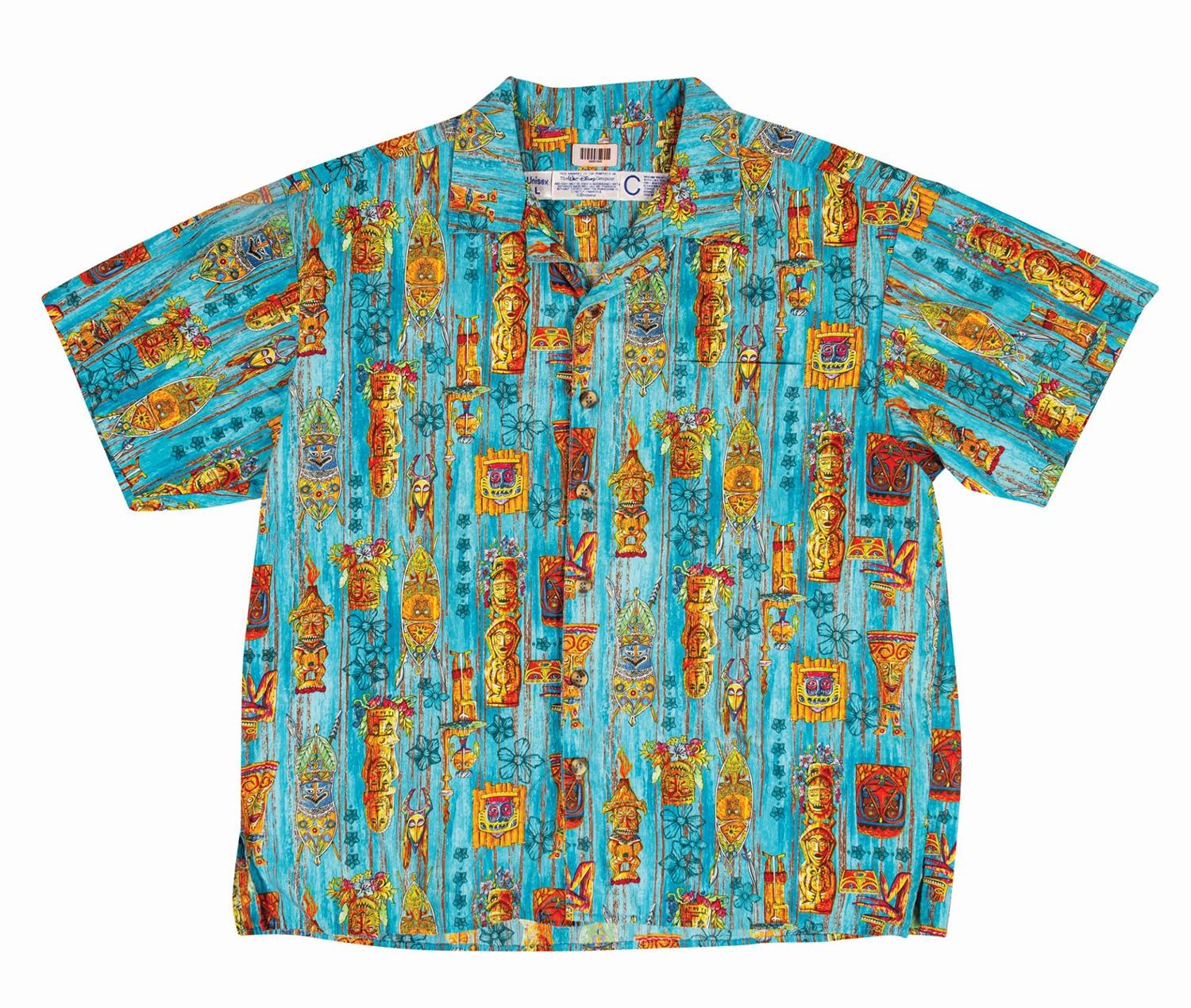 (Disneyland, c.2005) A cast member shirt for the Enchanted Tiki Room. This shirt pattern was first introduced for the 50th anniversary of Disneyland and features a tiki god pattern inspired by Imagineer Rolly Crump's original concept designs. The shirt is a unisex large and is in very good condition with minor wear.