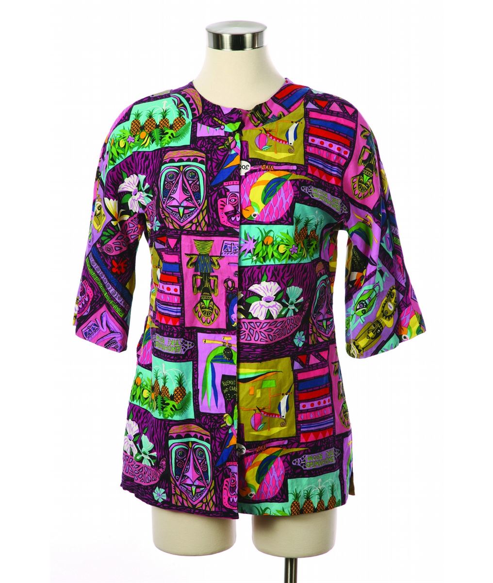 (Disneyland, 1963) Vintage large size woman's cast-member blouse from the Enchanted Tiki Room. Designed by Imagineer Rolly Krump, these custom designed exclusive fabrics were so popular that they were made available for sale in Adventureland retail outlets.