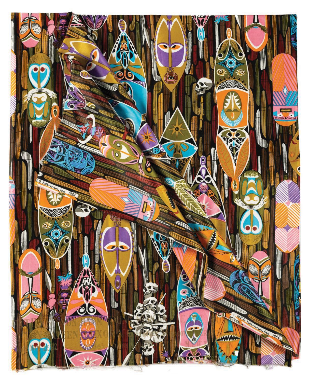 (Disneyland, 1964) More than two yards of vintage 1960s fabric, based on imagery seen throughout the Enchanted Tiki Room and Jungle Cruise. Fabric of this type was once exclusively manufactured and sold at Disneyland, with original large swatches of fabric such as this being very rare. Measuring 36"x89", the vintage 1960s lightweight fabric is in very good condition, retaining a WED Enterprises, Inc. label.