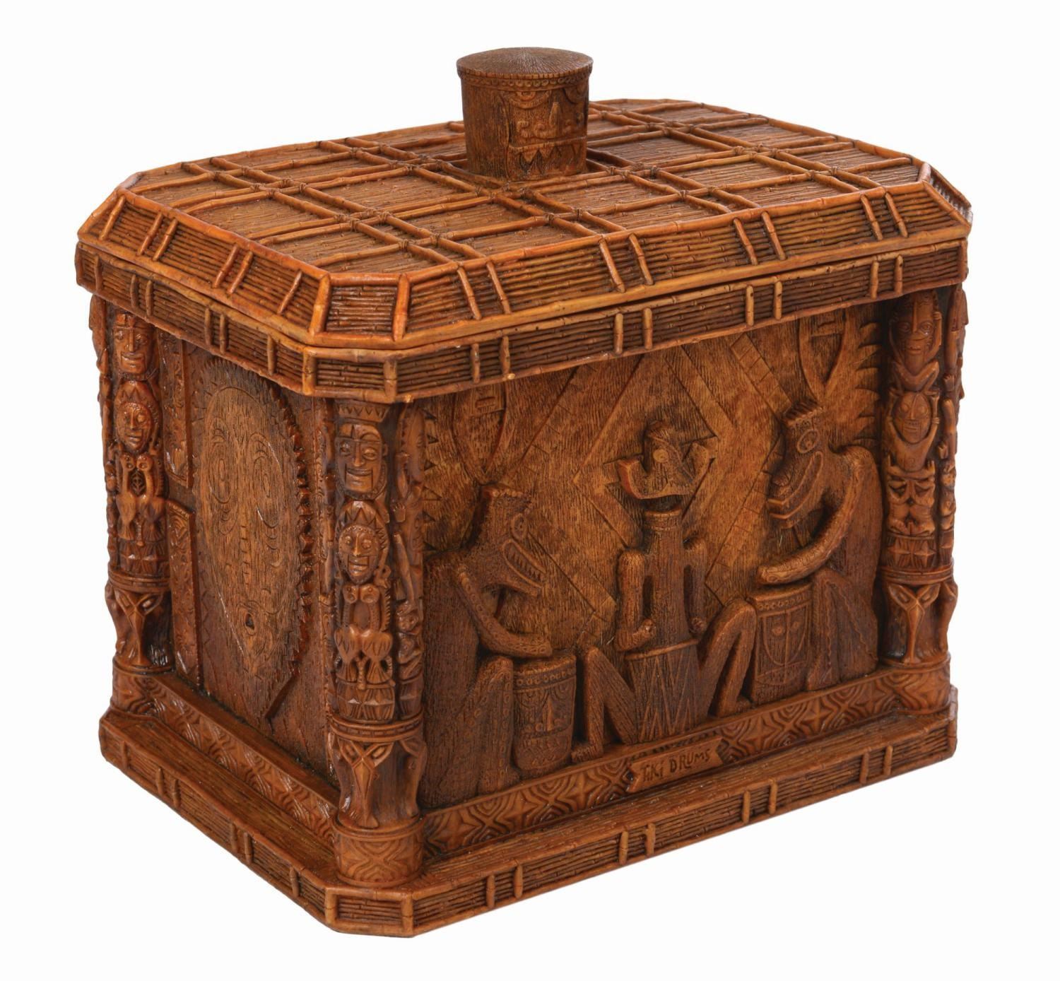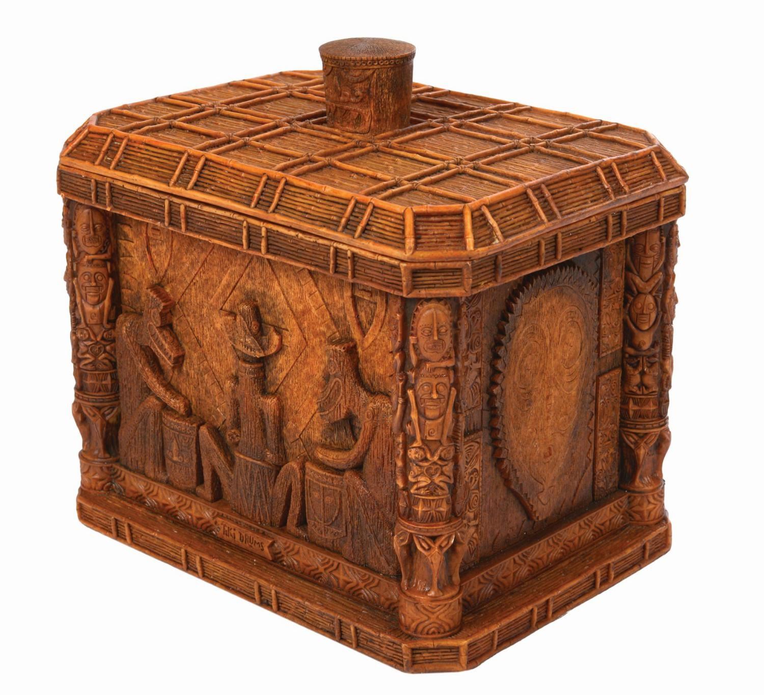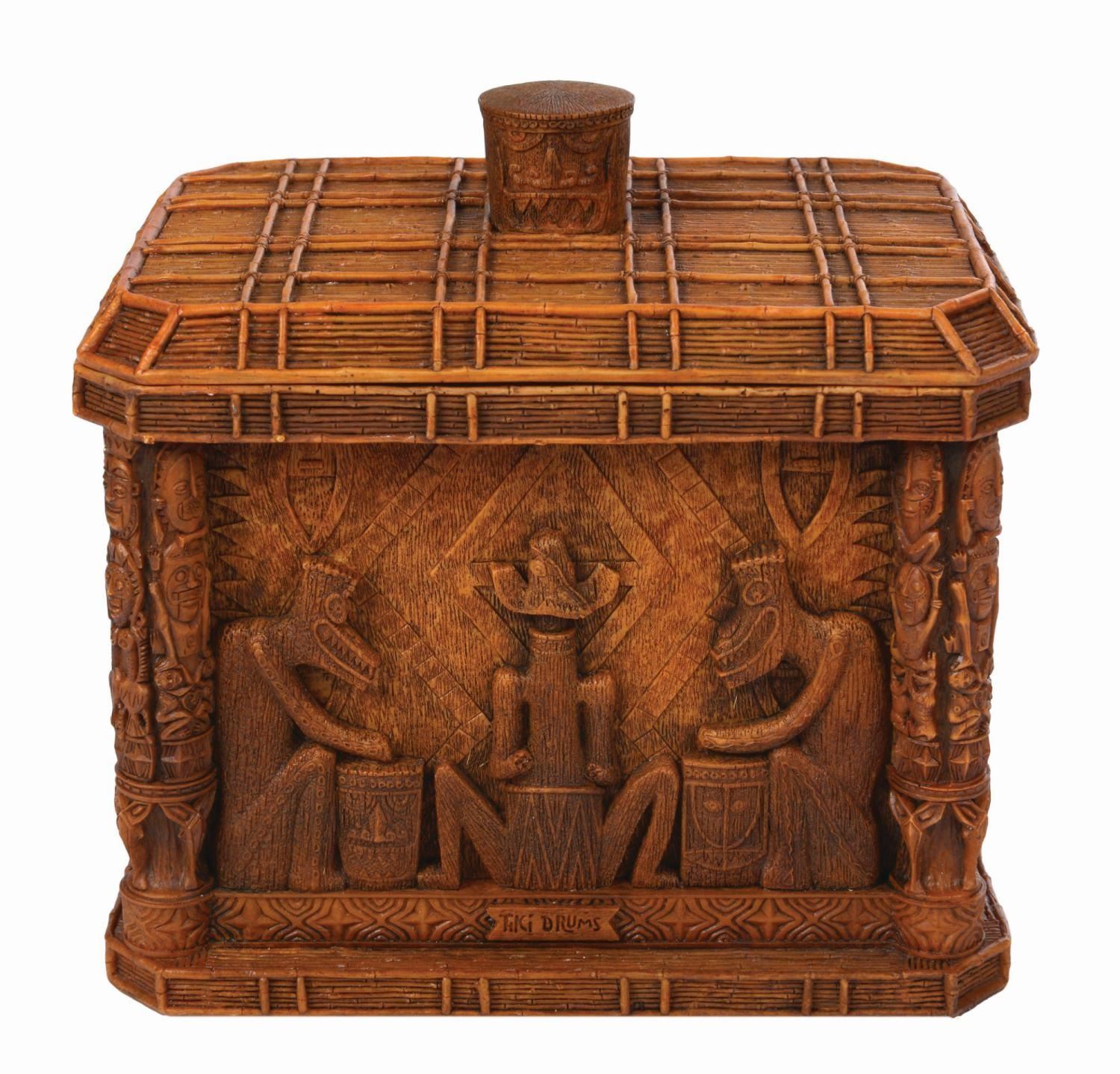 (Disneyland, 2007) A limited edition Enchanted Tiki Room Tiki Drummers Heirloom Box designed by Master Miniaturist Robert Olszewski. Constructed of cast resin, the ornate lidded heirloom box is meticulously sculpted in the style of Polynesian artisan-carved wood and bamboo. Inspired by the world-famous Tiki Room Drummers, the piece was created as a limited edition of 1,963 in honor of the attraction's opening year and is accompanied by a COA. Measuring 7"x7.25" and 5.5" deep, the box is in fine condition.