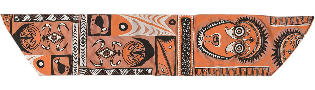 (Disneyland, 1980s) Impressive 14 foot by 31 inch wide canvas sun tarp designed for hanging over the pre-show area and the Tahitian Terrace Restaurant of the Enchanted Tiki Room attraction. Adorned