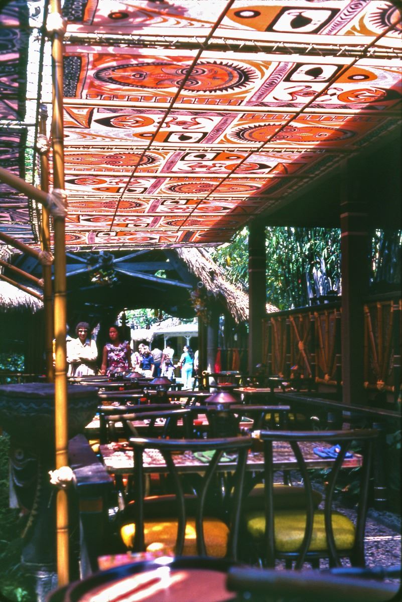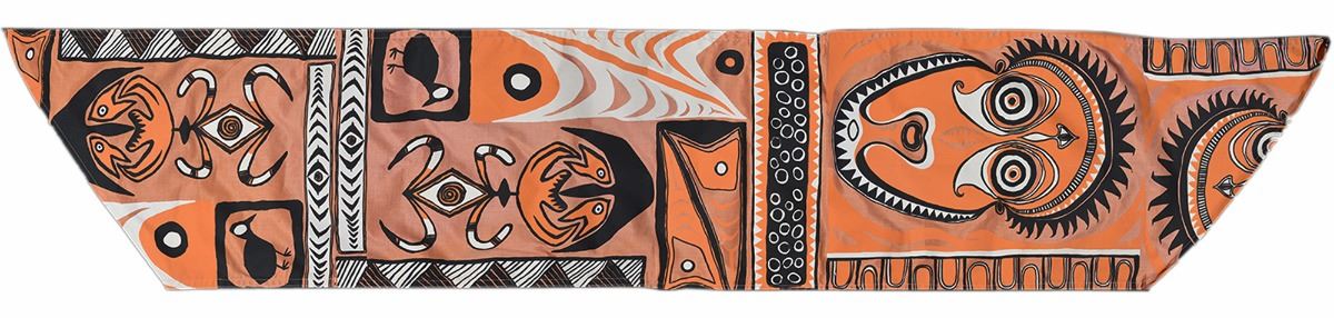 (Disneyland, 1980s) Impressive canvas sun tarp designed for hanging over the pre-show area of the "Enchanted Tiki Room" attraction as well as the "Tahitian Terrace" restaurant. Adorned with silkscreened tiki-style imagery, these tarps were replaced occasionally during regular maintenance and the park kept a supply in reserve. This piece was most likely not installed. Lined with brass grommets for hanging. Measures 14'x31". In fine condition.