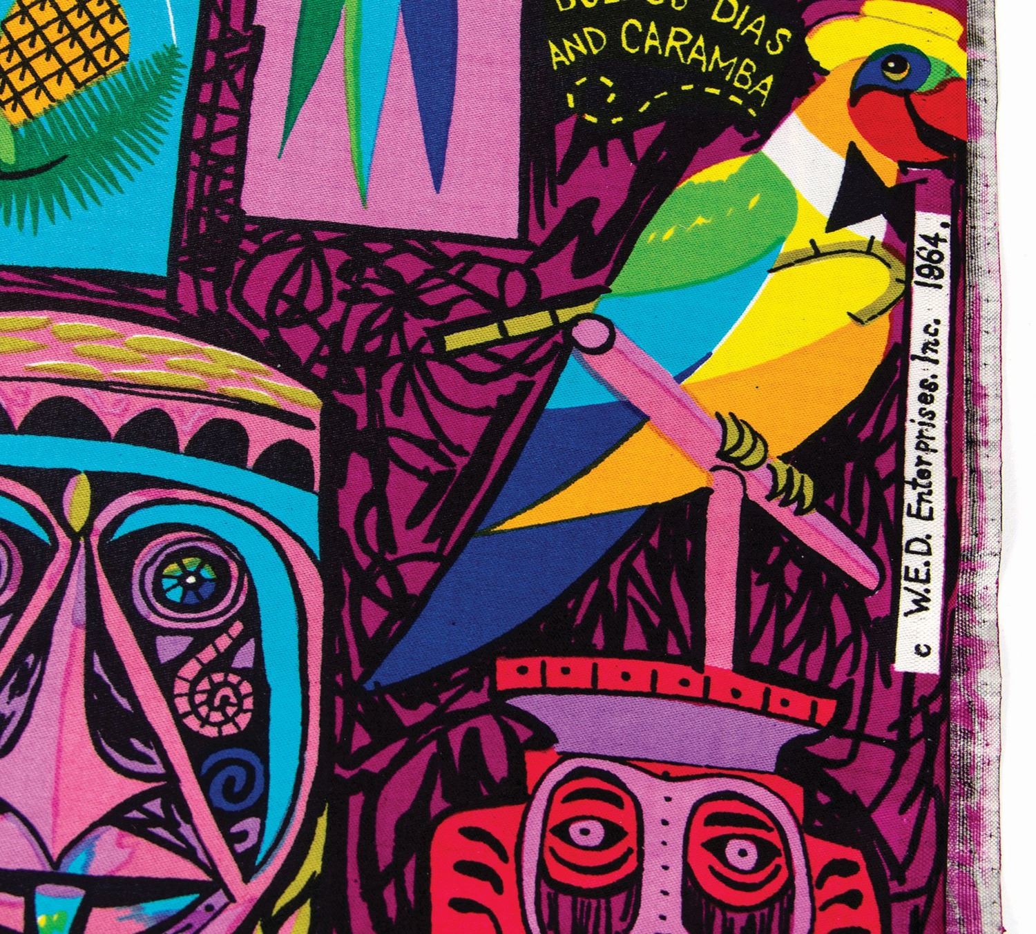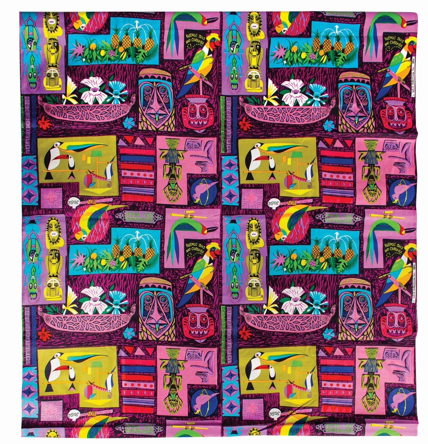 (Disneyland, 1964) A length of fabric with a vibrant tiki print patterned after Imagineer Rolly Crump’s designs for the Enchanted Tiki Room. This is the same fabric that was used to make the iconic cast member costumes for the attraction. In the era immediately following the opening of the Tiki Room, it was sold by the yard at Disneyland. Measuring 12'x3', the fabric is in fine condition.
