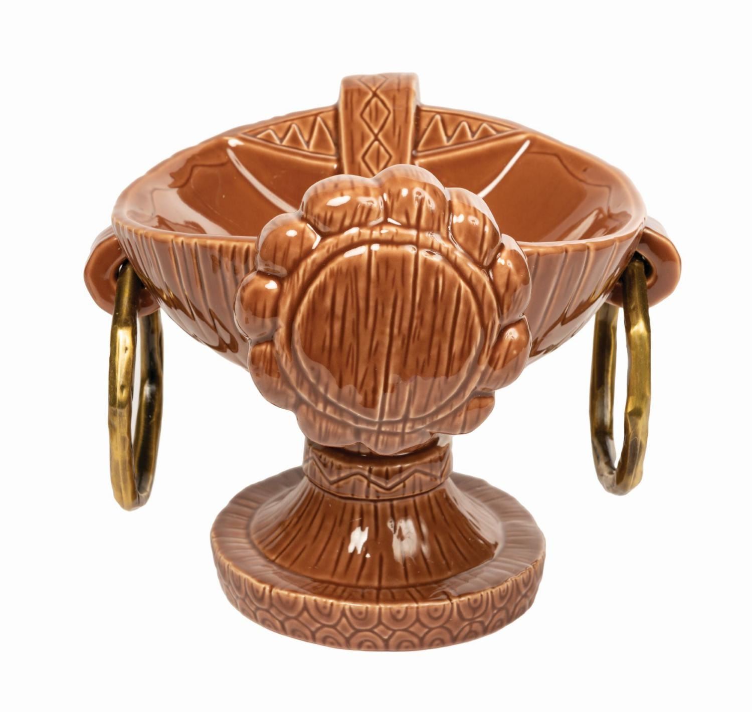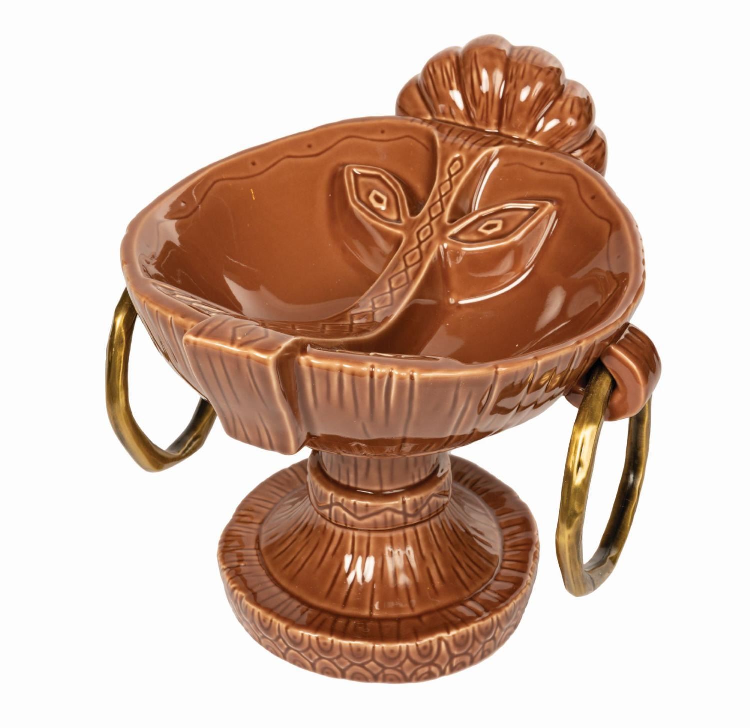 (Disneyland, 2009) A Limited Edition Uti bowl designed by Kevin Kidney and Jody Daily, in celebration of "50 years of enchantment" at Walt Disney's Enchanted Tiki Room. The Fishing Goddess (as originally Imagined by artist Roland Crump) is memorialized in glazed ceramic with polished metallic earring handles. The bowl, limited to an edition of 300, measures 9.5" tall and 12" in diameter, and is in fine unused condition.