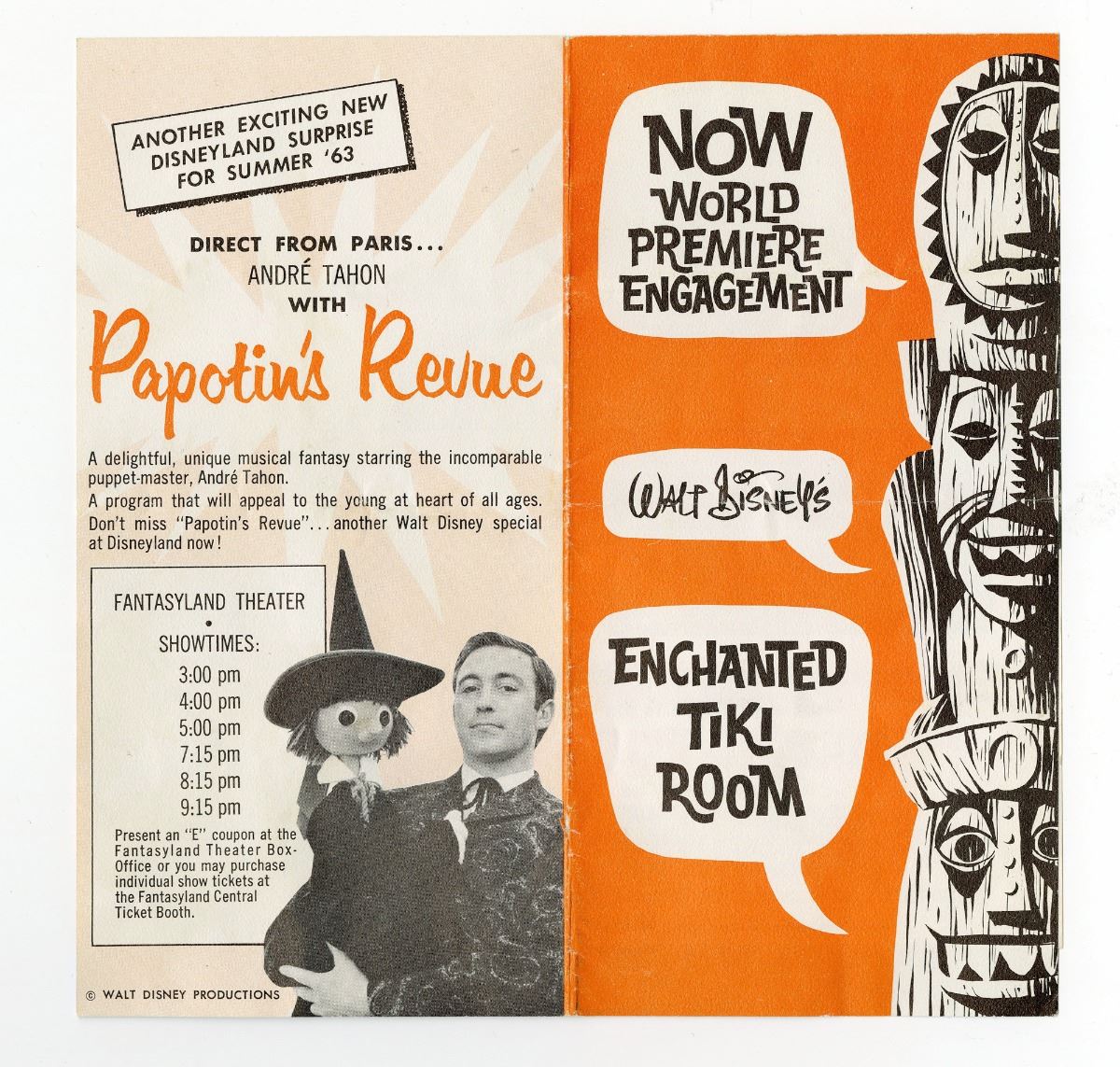 (Disneyland, 1963) Informative gate flyer for the new "Enchanted Tiki Room" attraction. These flyers were a necessity as the concept of audio-animatronics was so new, that Walt and the Imagineering team felt the public needed help to wrap their heads around the idea. Measures 14"x7.25" opened. In good condition with some wear along the fold marks.