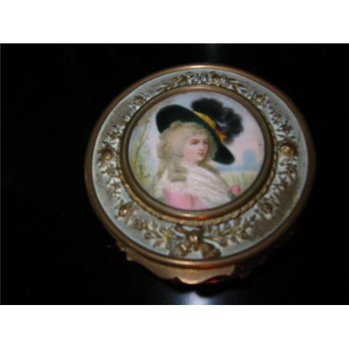 From France, enchanting hand painted signed by artist portrait on glass inside mirror box with magnificent detail floral ormolu french pattern and magnificent bronze detailed art work. base is signed Ohlen on the bronze. made of hand painted signed by beivel portrait of a french woman with black feather hat and pink bouse, long hair, beautiful but serious smile, with pastel colors. outside and inside lid has wonderful bronze decoration. in excellent condition.  2 " T. - 3.5 " in Diam.  gorgious for vanity. collectible, decorative.