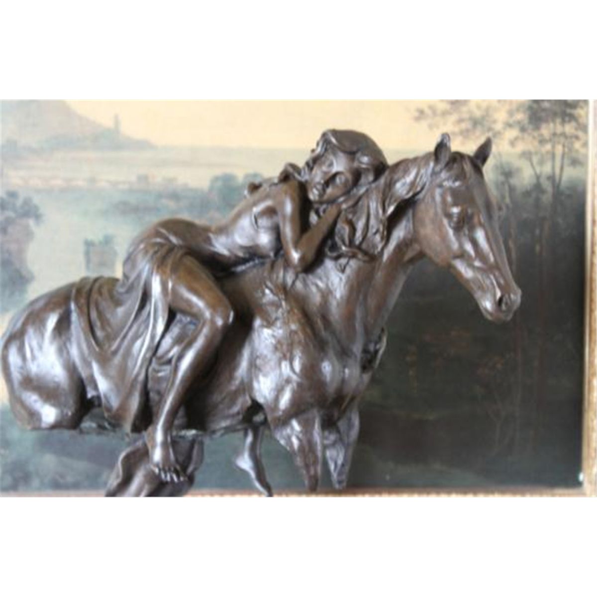 Lady on Horseback, Bronze Sculpture, 16"H x 17" L x 6"D 22lbs This bronze sculpture was produced using the "Lost Wax" casting method. The"Lost Wax" Cast method is the most precise metal casting technique in existence, ensuring exquisite detail of the original host model which is usually sculpted in clay or wax. This "Lost Wax" casting method is an extremely labor intensive and expensive process, but the end results produce a Heirloom Quality Masterpiece!