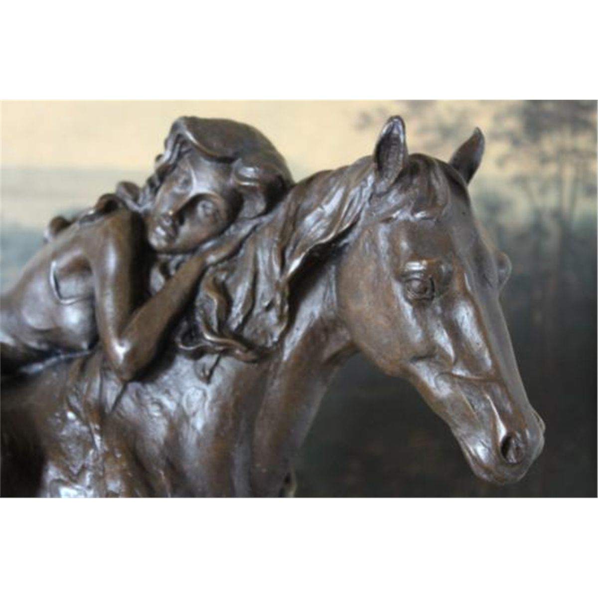 Lady on Horseback, Bronze Sculpture, 16"H x 17" L x 6"D 22lbs This bronze sculpture was produced using the "Lost Wax" casting method. The"Lost Wax" Cast method is the most precise metal casting technique in existence, ensuring exquisite detail of the original host model which is usually sculpted in clay or wax. This "Lost Wax" casting method is an extremely labor intensive and expensive process, but the end results produce a Heirloom Quality Masterpiece!
