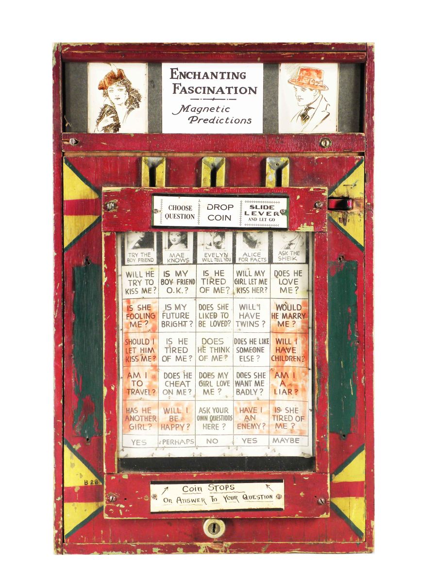 Coin Operated Enchanting Fascination Magnetic Predictions Machine. Wood cabinet, comes with key. Fair original condition. 12 1/2 X 21 X 4 inches.
