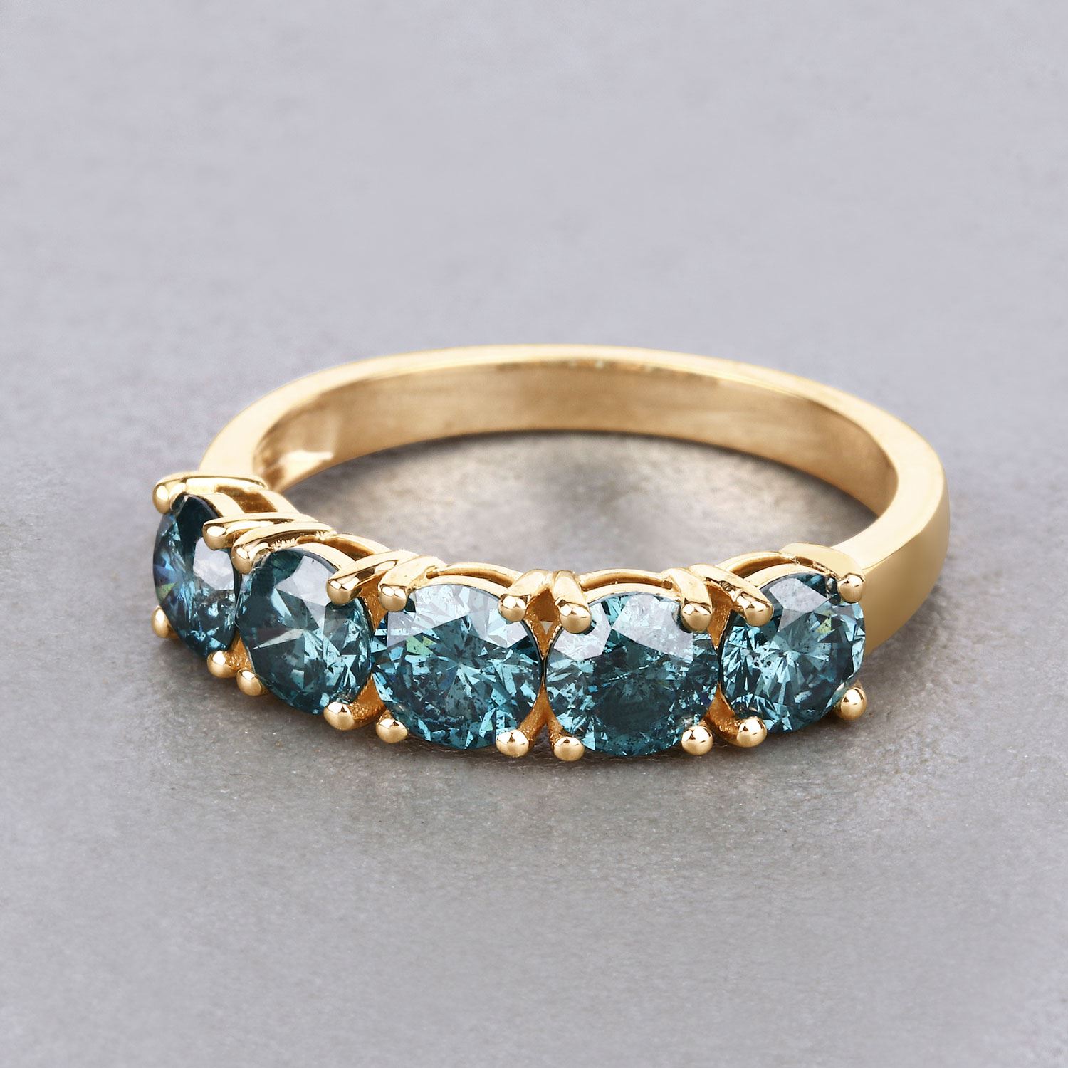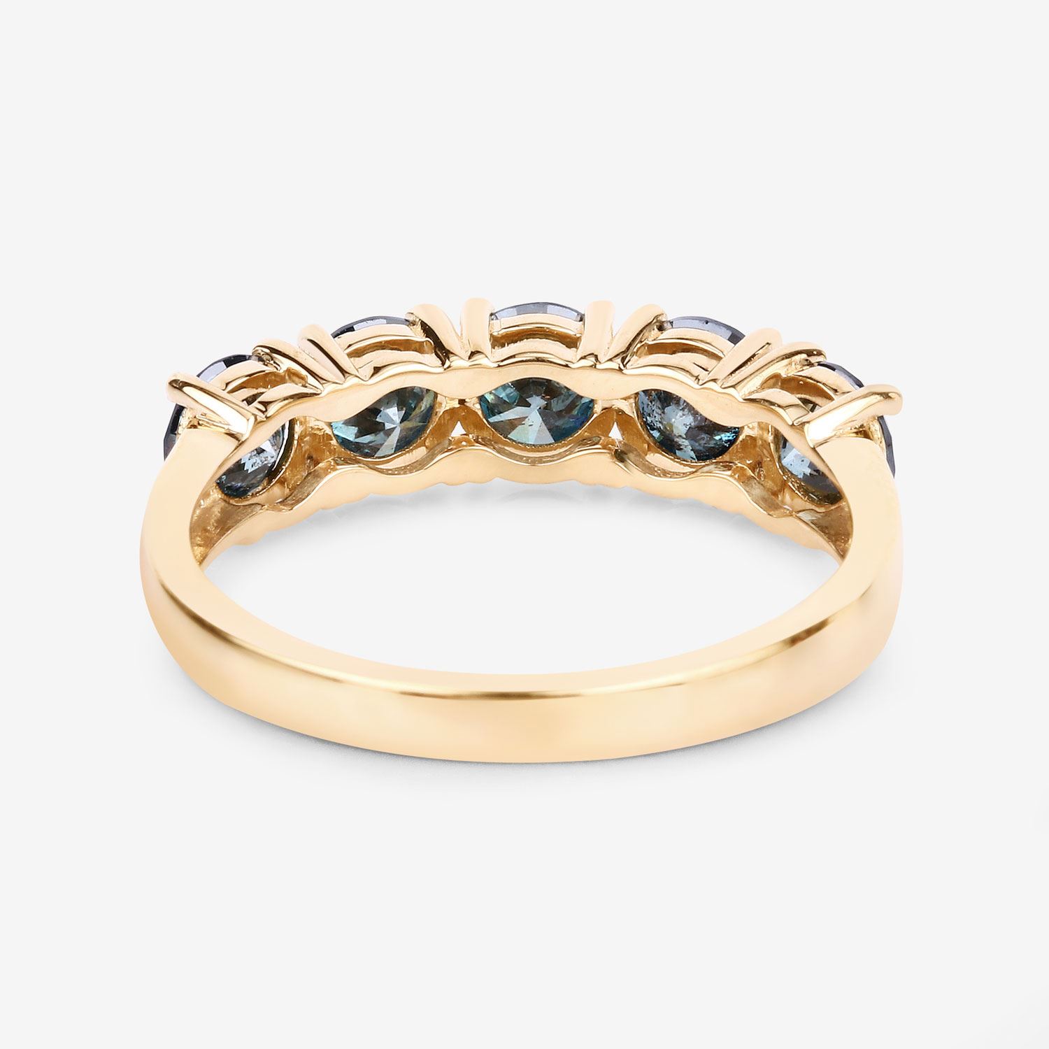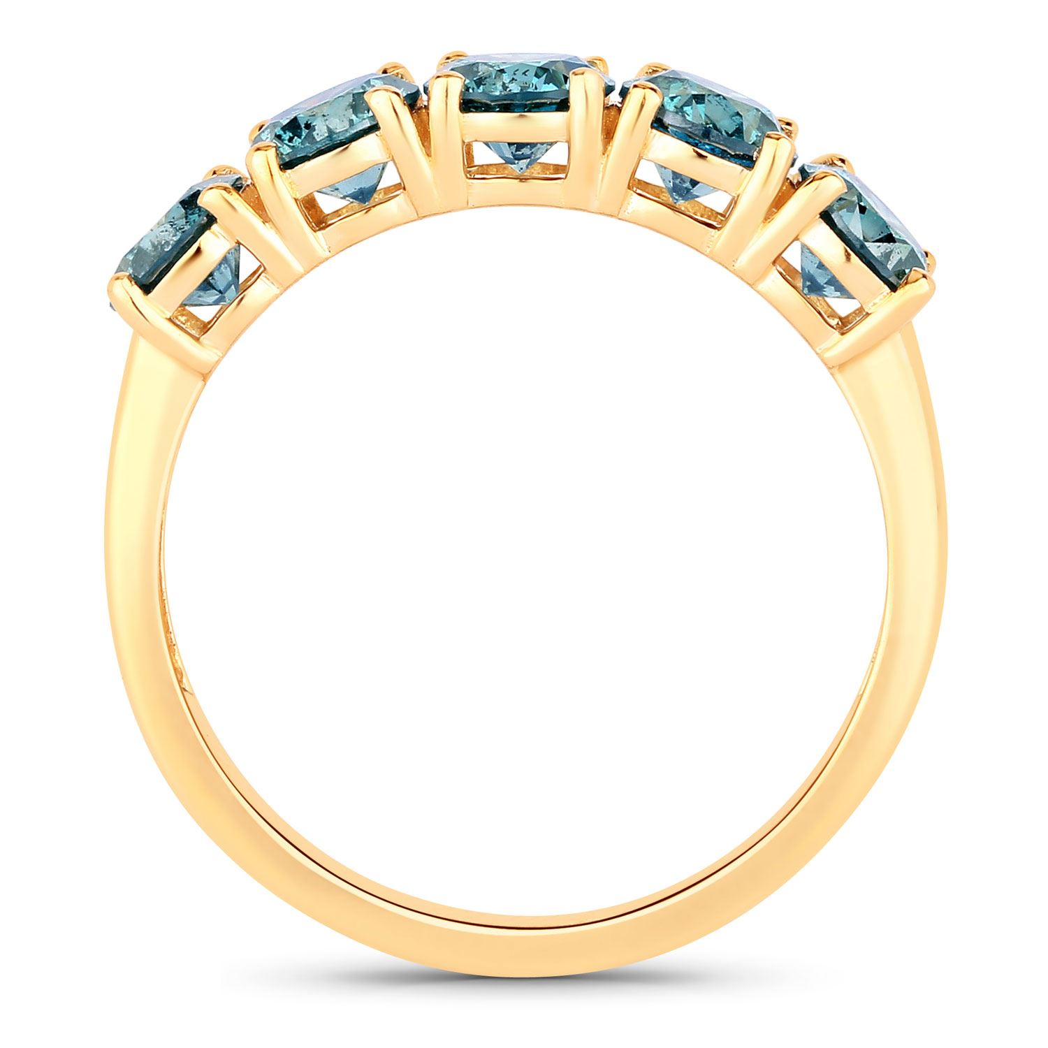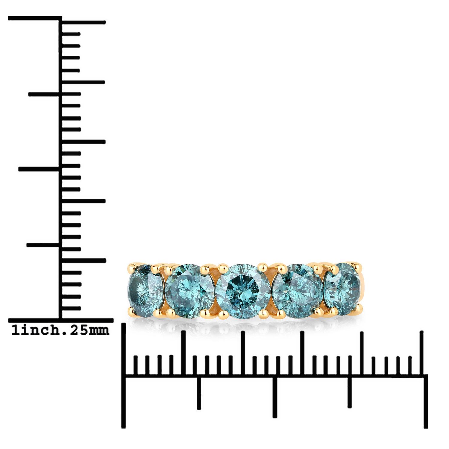 If blue diamonds formed 4 times deeper within the earth, now that they are out, shouldn't you take them out and show them off four times more often? This 14 karat yellow gold ring is stunning and features 1.83 carats total weight of round, brilliant-cut, blue color, I1 clarity diamonds that are prong-set in a row that shoulders up to a polished shank, tapering to 2.5mm.& nbsp; The ring is US size 7.& nbsp; See below for sizing details and other information.