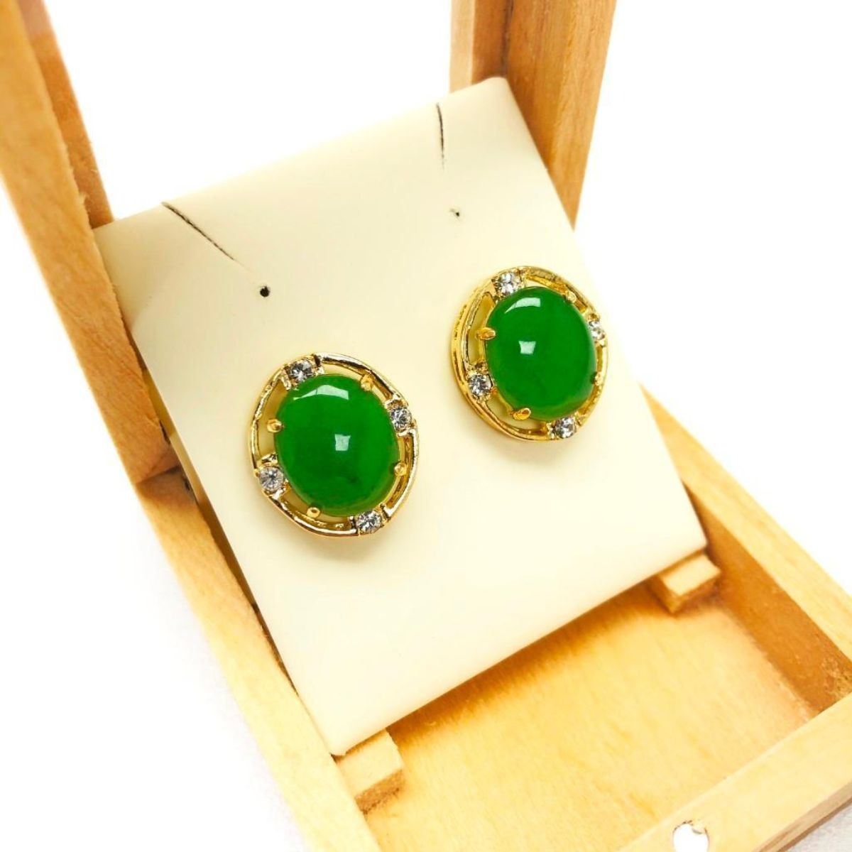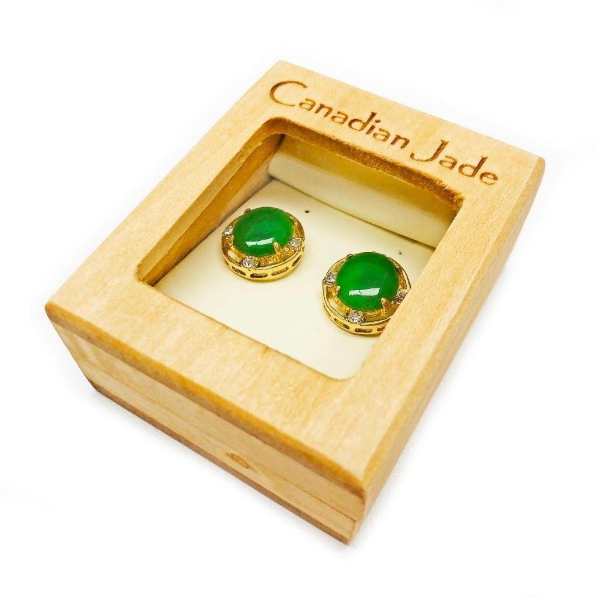 Enchanting Pair of Ladies 1.78ct Oval Cut Canadian Jade Stone in 18KT Gold Plated Mount Jade, the stone of heaven has been prized throughout history. A stone of mystical power, ancient civilizations valued jade as the most precious of all gemstones. The world's finest nephrite jade can be found in the Cassir Mountain Range in British Columbia, the Yukon and Alaska. This tough translucent Stone is challenging to carve, however will stand the test of time and its harsh elements.