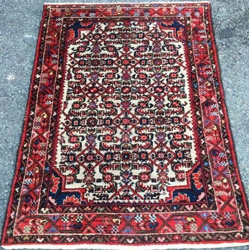 Enchanting fine village made Persian asad-abad Hamedan Rug. 100% natural hand woven, vegetable dye, wool pile on cotton foundation. The village of asad-abad produces a very limited number of Hamedan. However, the limited few that are produced are superior in terms of wool quality, design and color scheme. It is intriguing to mention that these vibrant and charming pieces are woven by the women of the household with very little education, if any at all. this asad-abad Hamedan is a perfect example of man's intrinsic genius striving for beauty and perfection, and in this case, in the form of a hand woven rug, an art underfoot. This piece has a fairly lush and glowing wool pile, plus a well pronounced design, which is indicative of a superior quality. This asad-abad Hamedan is a diamond in the rough. Size: 5 feet X 3 feet 5 inches. Country of Origin: Iran.
