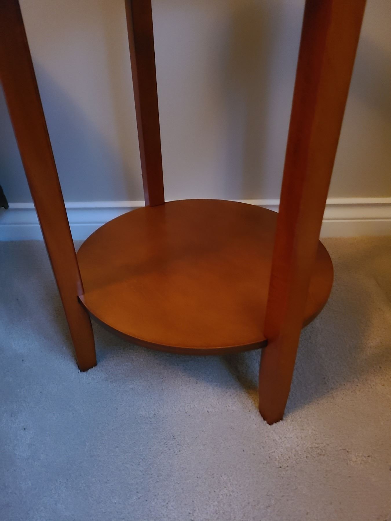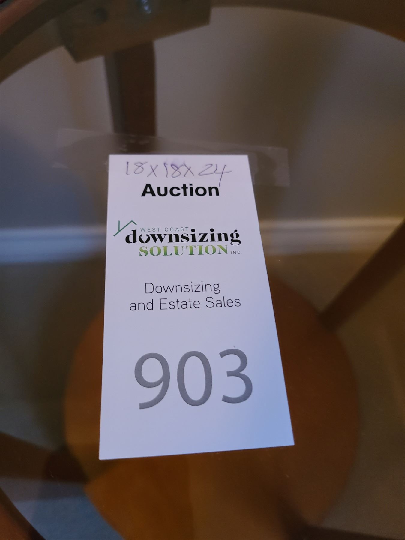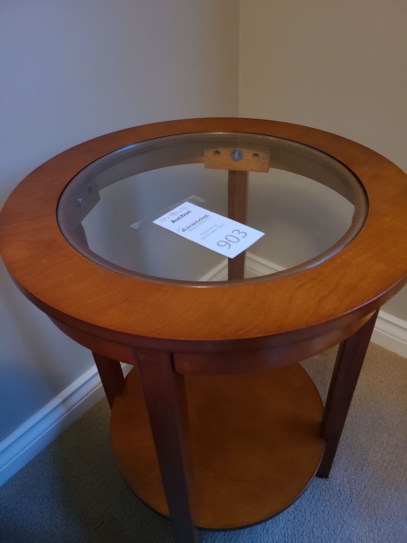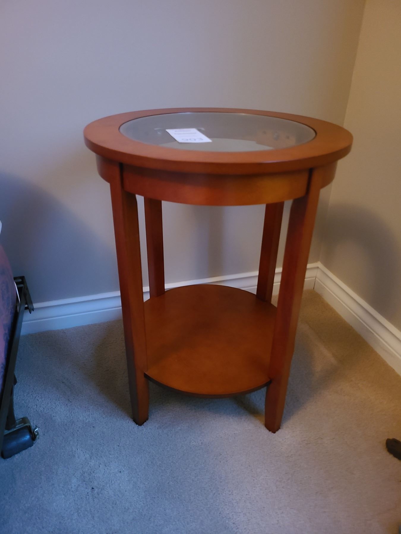 Small wood and glass end table 18x18x24. Pickup 11 am.