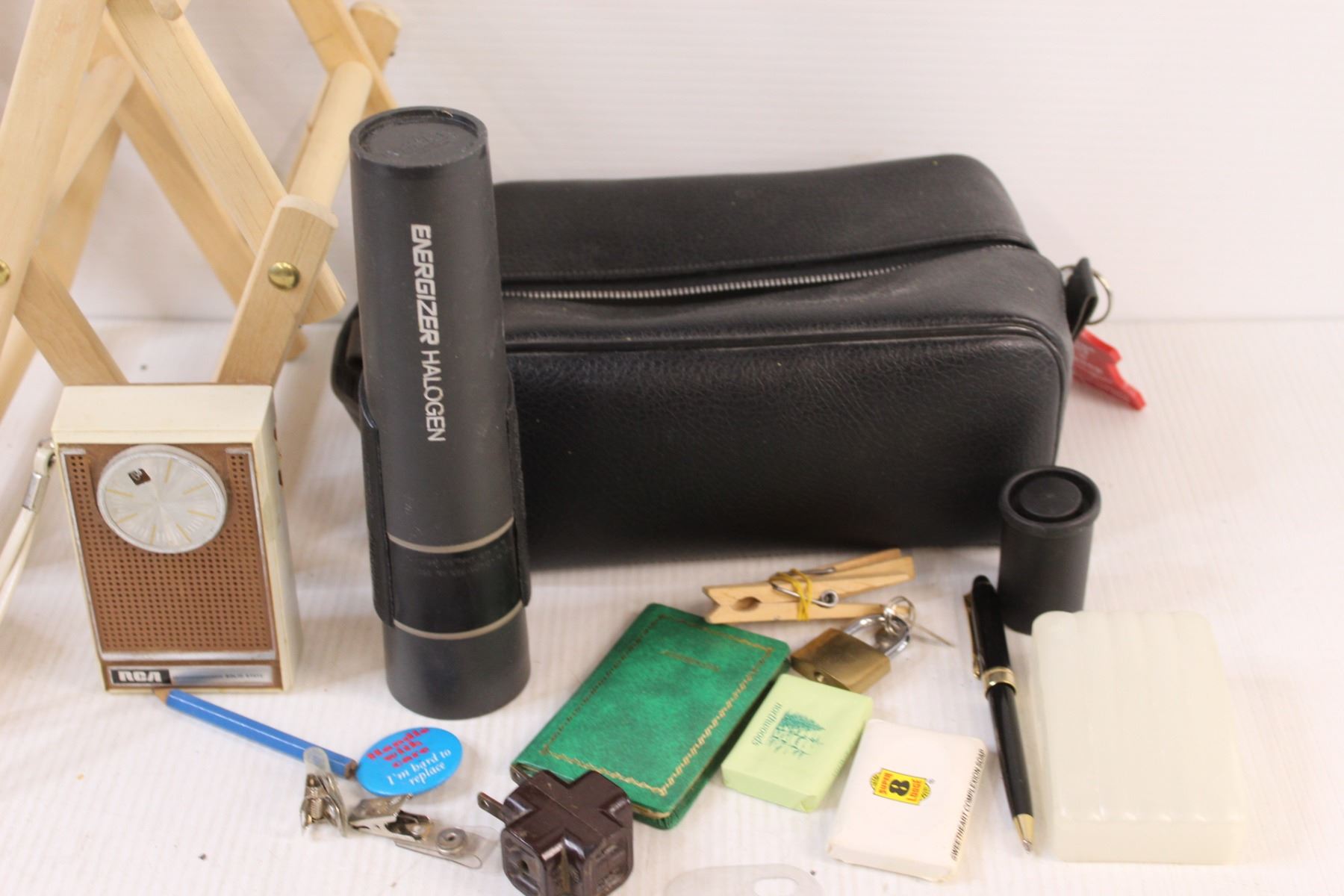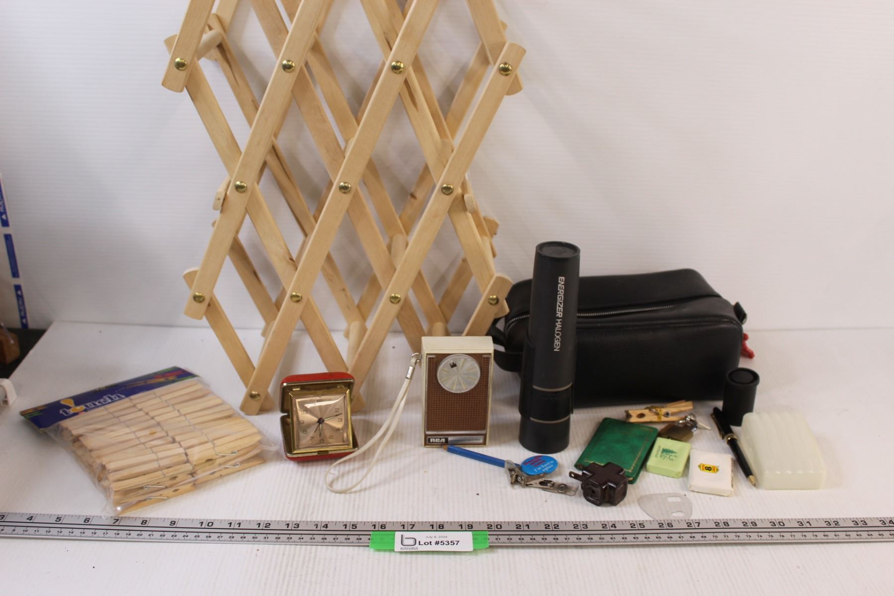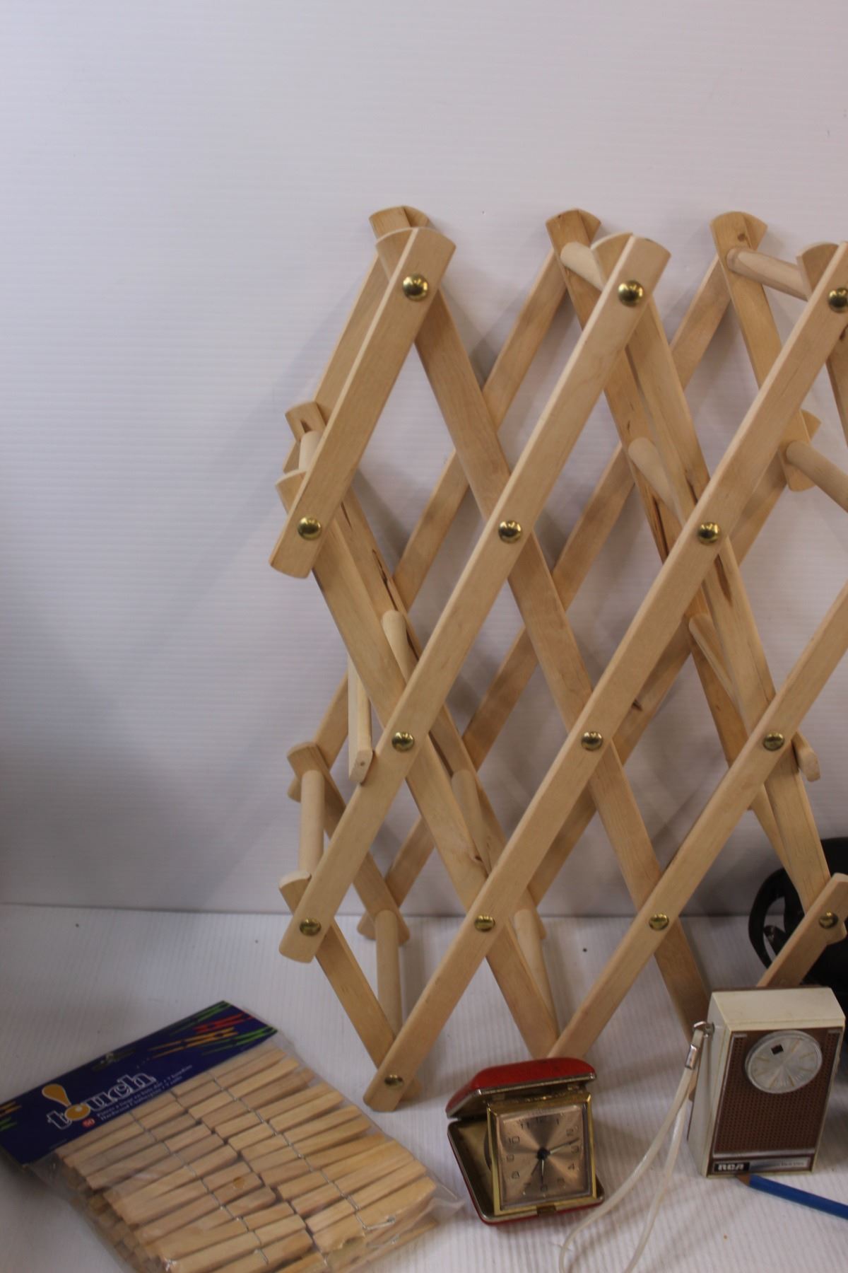 End Table Clock (as is), RCA Portable Radio (as is), Wine Rack, Clothes Pins, Misc.
