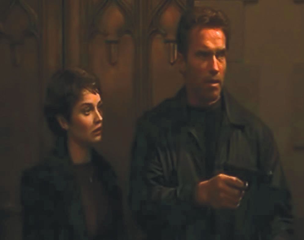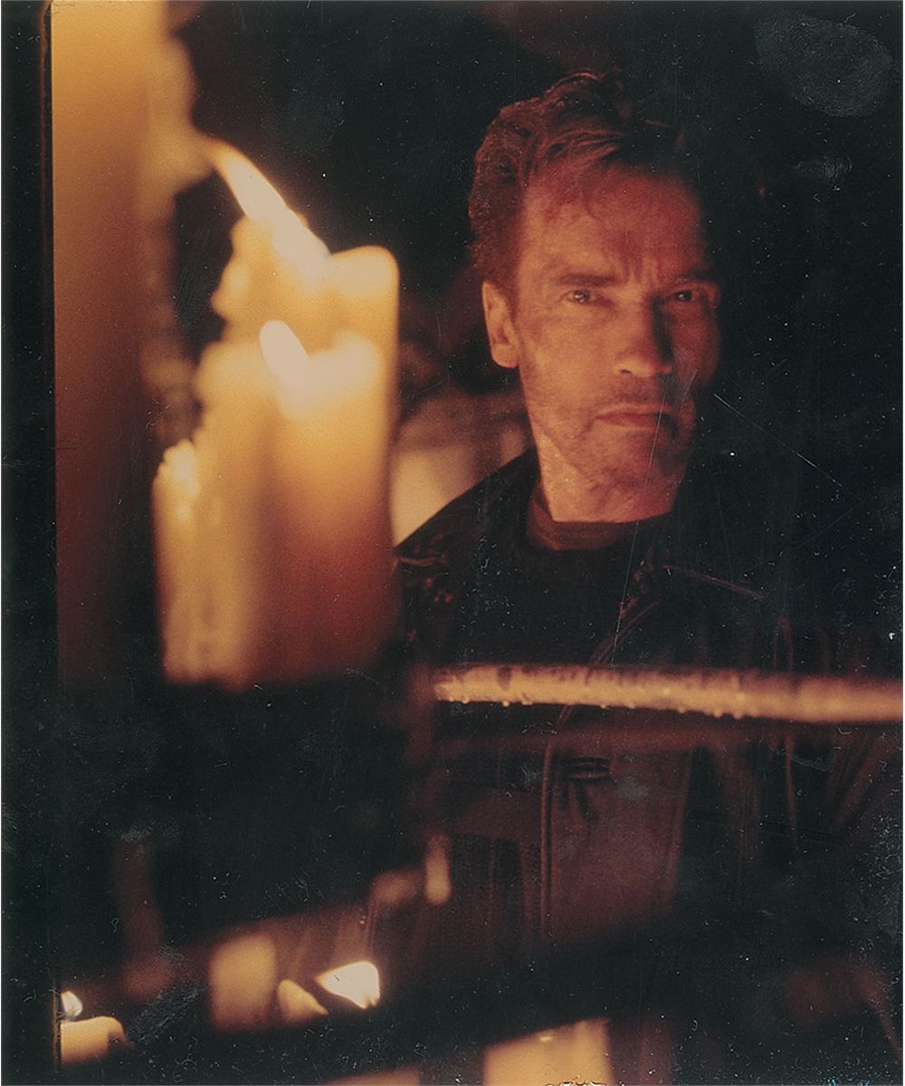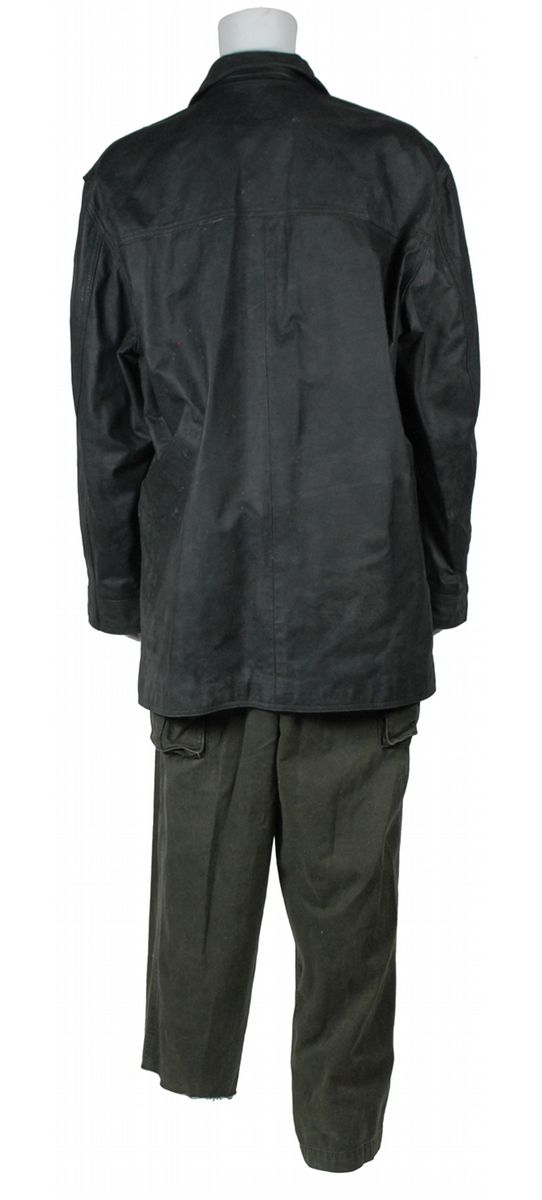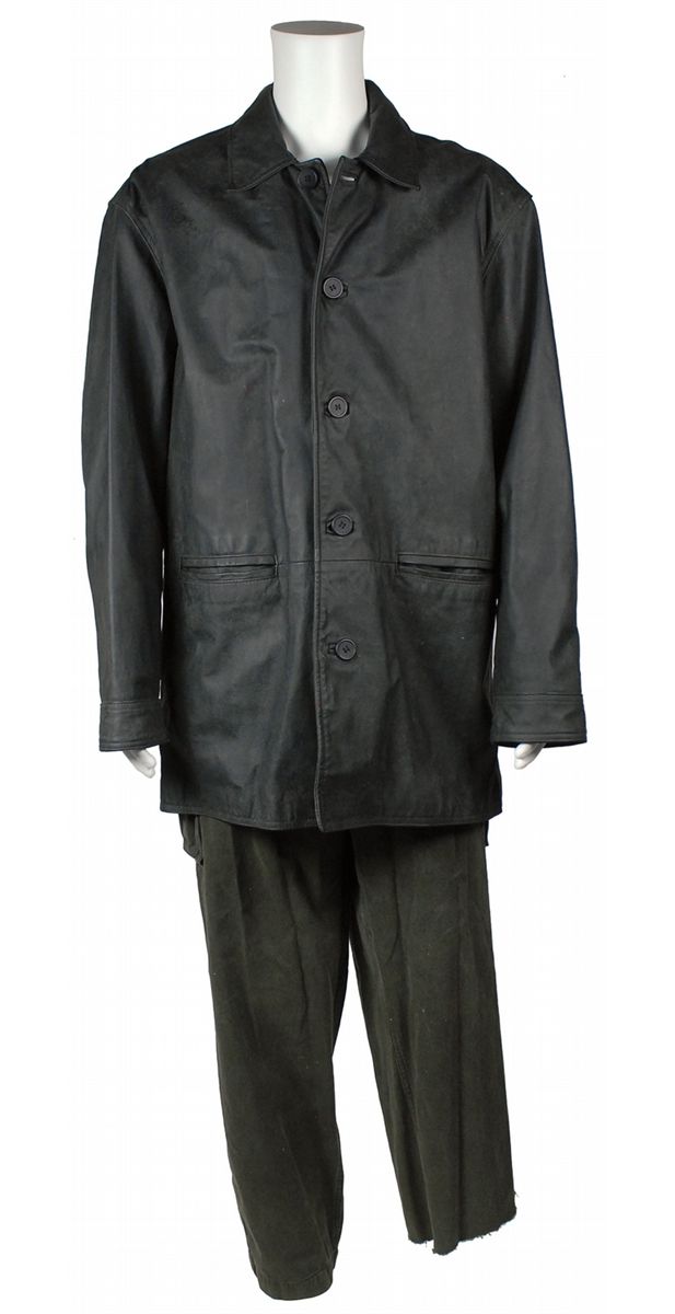 Screen-worn costume worn by Schwarzenegger in his role as Jericho Cane in the 1999 film End of Days. Costume consists of a black leather coat with a five-button front and a pair of gray cargo pants. Accompanied by a photo of Schwarzenegger from the film wearing the jacket. Also accompanied by two certificates of authenticity from Startifacts, a VHS copy of the film, and a small promotional pin. In fine condition.