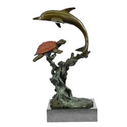 Bronze and marble base Dolphin Sea Turtle sculpture (14"X9")