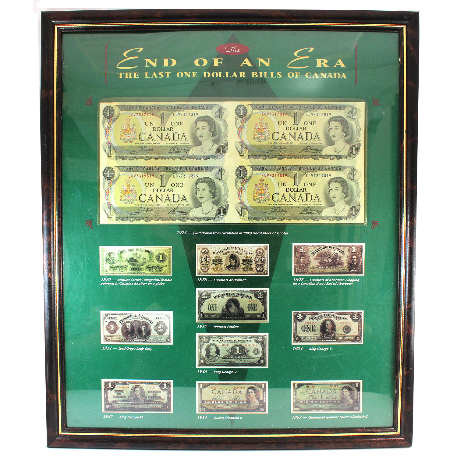 With an uncut block of 4x 1973 $1 banknotes with ECV Prefix. Features a print of photos of Dominion of Canada and Bank of Canada $1 banknotes throughout history. Some damage to frame.