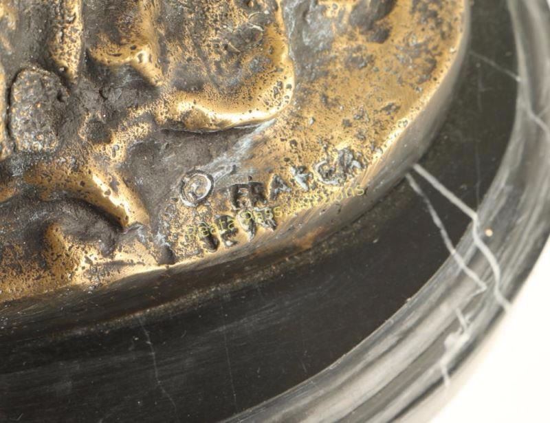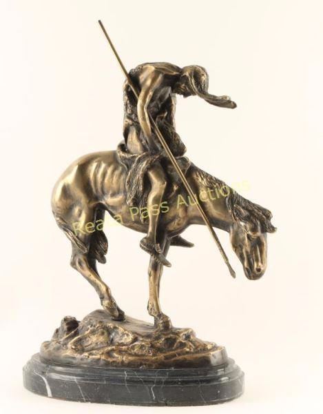 Brass sculpture on marble base. Measures 15 1/4" x 10" x 5". Signed 'Fraser' on base. Some minor chips otherwise good.