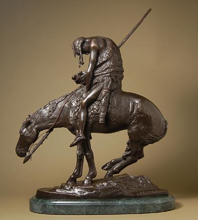 This iconic Western bronze was originally sculpted by James Earle Fraser in 1918 for display at the World's Fair in St. Louis. It depicts the raw emotion of an Indian fighter on his horse, both spent and exhausted after years of a losing battle to hold back White settlers and their army. They have truly reached the end of their trail.