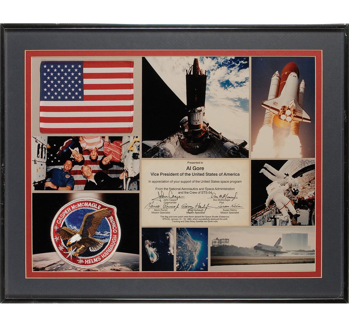 Flown printed fabric American flag, 5.5 x 4.25, and a flown embroidered four-inch diameter mission patch, both flown aboard the Space Shuttle Endeavour on mission STS-54, January 13–19, 1993. Both the flag and patch are presented against a photographic background with a card in the center bearing the printed inscription, “Presented to Al Gore, Vice President of the United States of America, in appreciation of your support of the United States Space Program, from the National Aeronautics and Space Administration and the crew of STS-54,” and is signed in black felt tip by crew members John Casper, Don McMonagle, Mario Runco, Greg Harbaugh, and Susan Helms. The entire presentation is framed to an overall size of 20.5 x 16.25. In fine condition, with some mild edge toning to signed card. Flown items from any mission presented to such a high-ranking politician are seldom encountered.