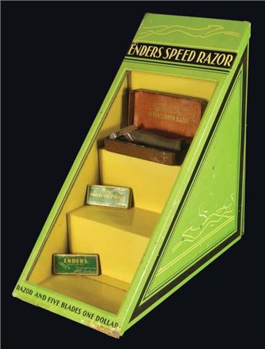 Enders Speed Razor Tin Store Display with one razor and 2 packs of razor blades. Excellent Condition. 6 x 11 x 11 inches.