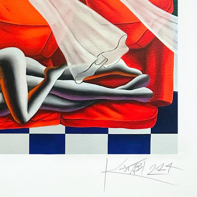 "Endless Love" is a limited edition serigraph on paper numbered and hand signed by Mark Kostabi. Includes Certificate of Authenticity. Measures approx. 21.5" x 35.5" (border) 13.5" x 28.5" (image).