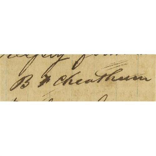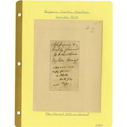 <B>Endorsement Signed by Two Confederate Generals - Leonidas Polk and Benjamin Franklin Cheatham.</B></I> Endorsement on lined paper, 2.5" x 4.5", impressed onto 6" x 8" page, fine. Cheatham was a corps commander under Hood in the Franklin-Nashville Campaign and Leonidas Polk was disemboweled by a Union artillery shell at Pine Mountain in 1864.<BR><BR><b>Shipping:</b> Small Flat (<a target="_blank" href="http://www.heritageauctions.com/common/shipping.php">view shipping information</a>)