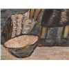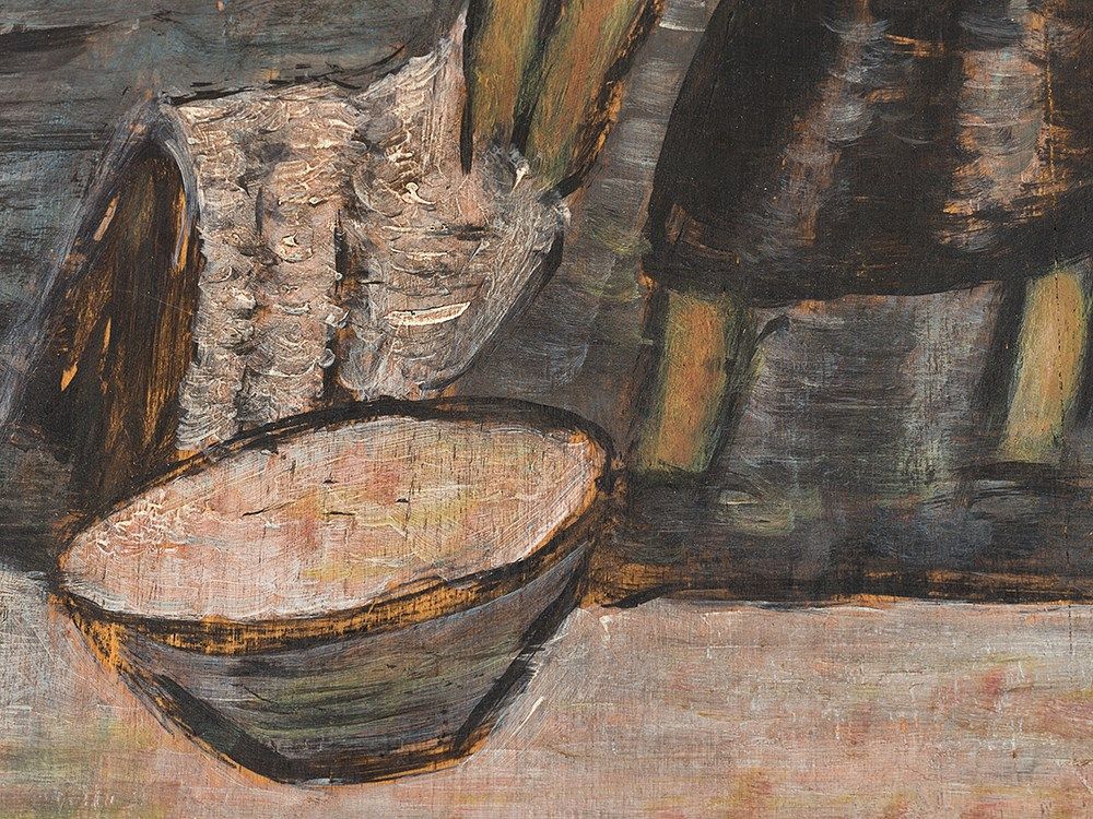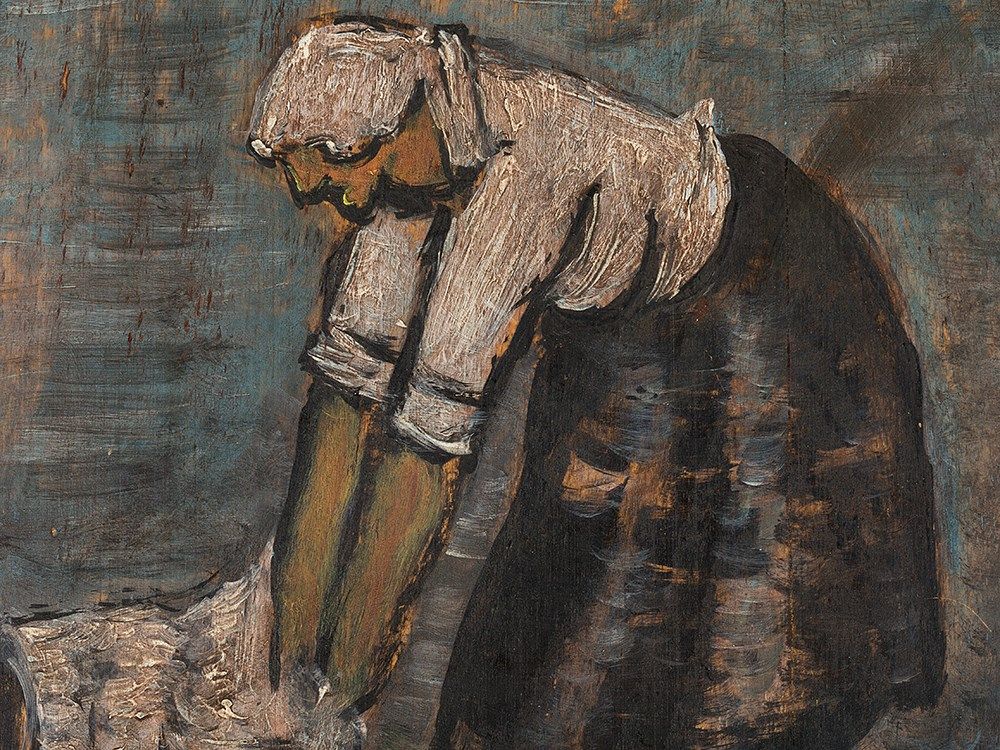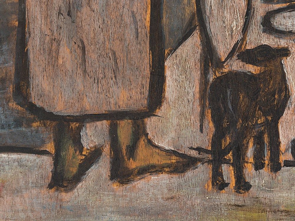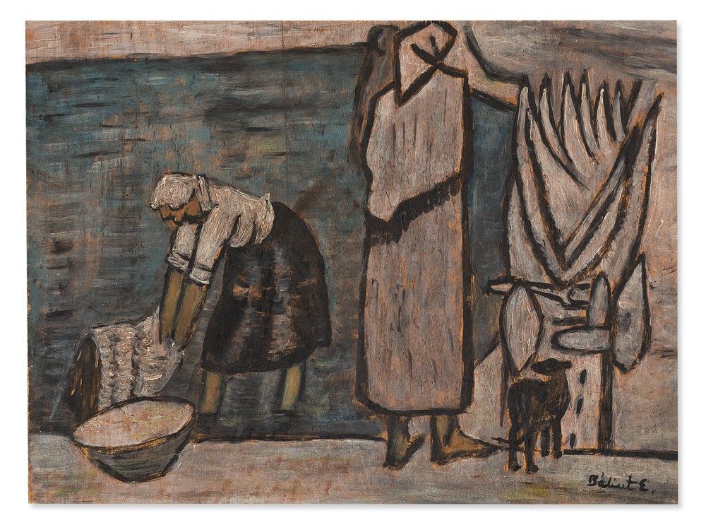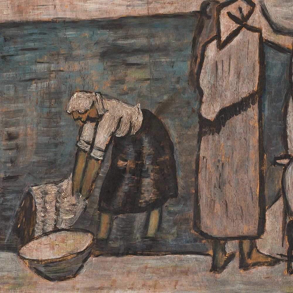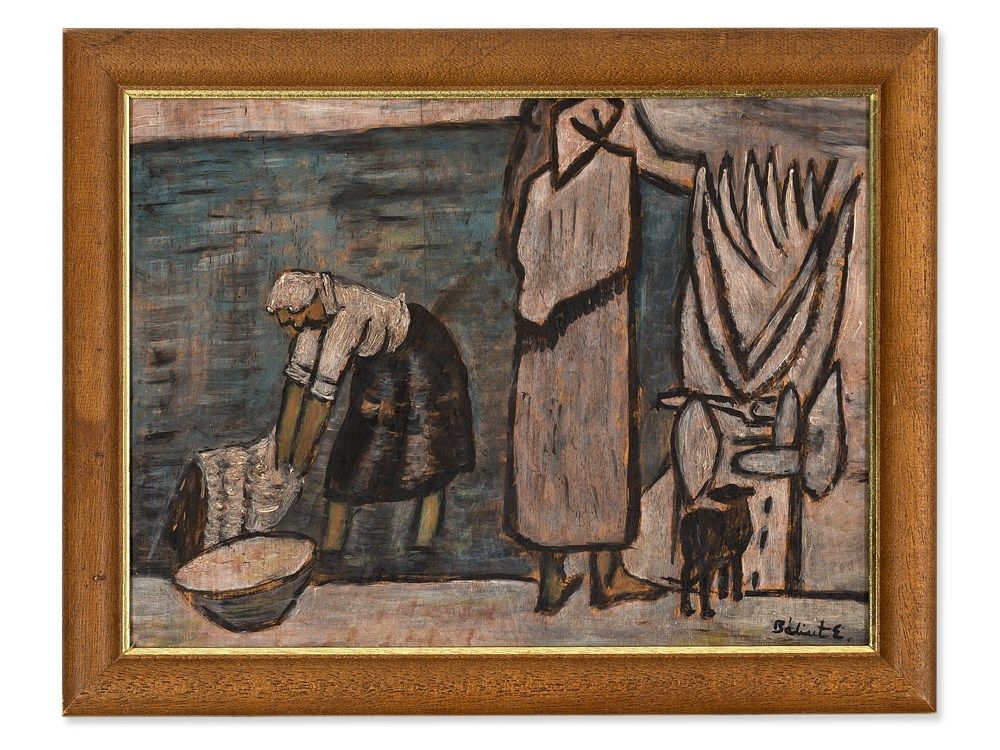 The present oil painting is the work of the Hungarian painter, graphic artist and writer Endre Bálint (1914-1986). The abstract depiction shows a laundress at the shore, and to her right, a woman with a dog. The painting is characterized by a fine iridescent color range, which is dominated by a delicate rose-tone. A planar painting style and black contour lines are further striking features of Balint's composition.
