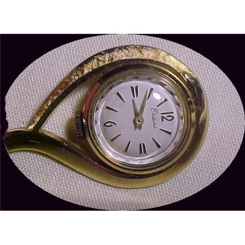 Graceful Tear Drop shaped pendent Watch. The brand name is Endura and it is Swiss Made. This is a vintage manual wind that works excellently. The inside of the bezel has a beveled crystal that sparkes. The design of that the watch sets in is of a smooth goldtone finish on one side and the other side it is textured. The pendant is 2" long. The entire drop length of the chain with the pendent is 14". <p> The condition is nearly excellent. There are a few microscopic scratches on the cystal that can only be seen with the aide of the high magnification of a jewelers loop.