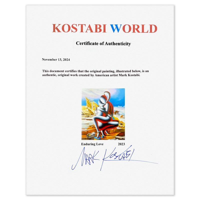 "Enduring Love" is an original oil painting on canvas by Mark Kostabi, hand signed by the artist. This piece comes framed. Includes Certificate of Authenticity. Measures approx. 22" x 20" (frame), 12" x 10" (image). This item requires special handling and may have a longer than usual turnaround.