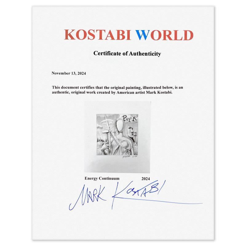 "Energy Continuum - New York" is an original drawing on paper by Mark Kostabi, hand signed by the artist. This piece comes custom framed. Includes Certificate of Authenticity. Measures approx. 13" x 12.5" (frame), 7" x 6.5" (image). This item requires special handling and may have a longer than usual turnaround.