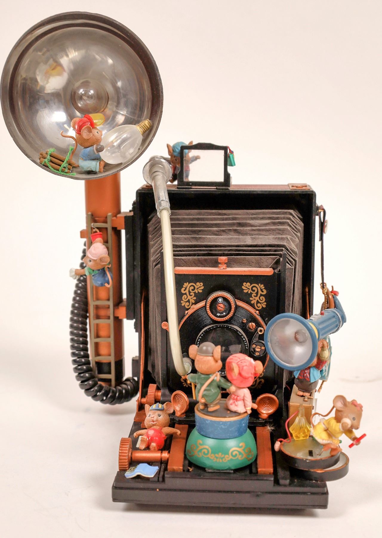 Approx 8 x 11 x 8" Fancy modern artistic and whimsical art piece. Does not play, plastic flash handle cracked.