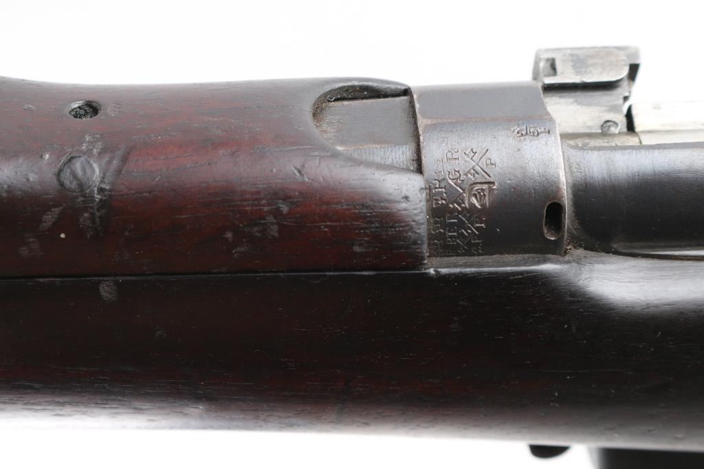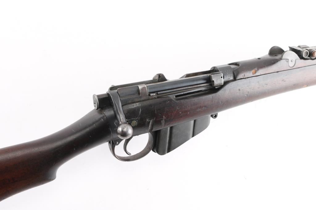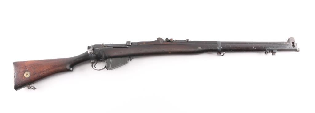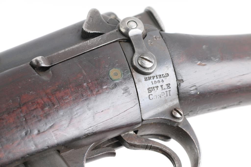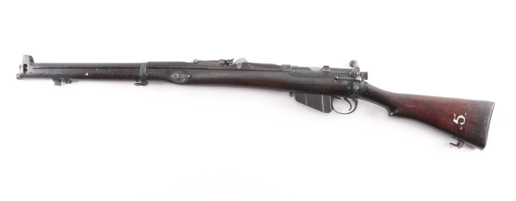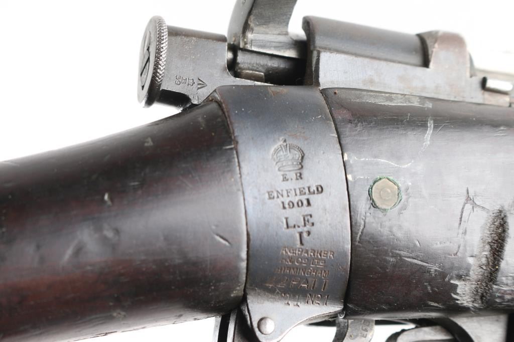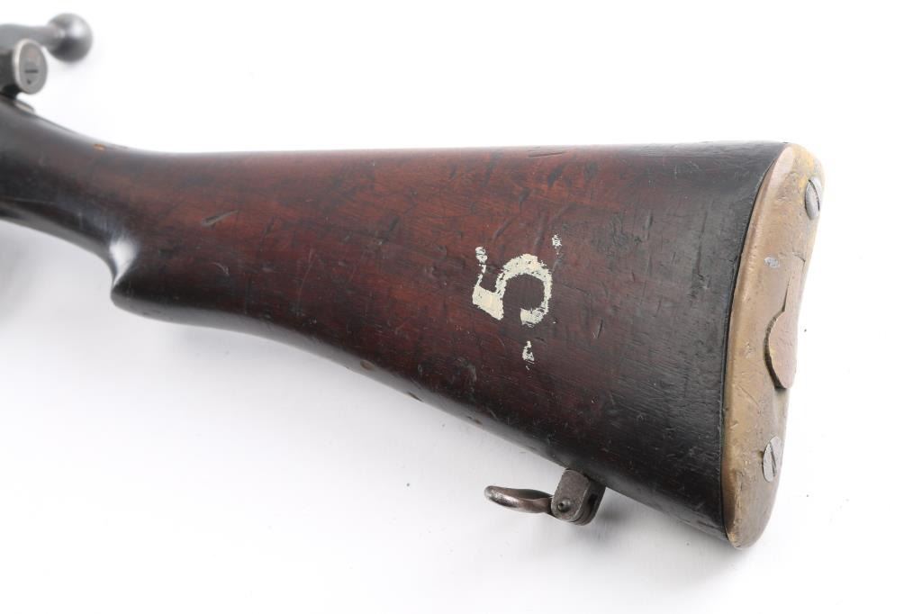 British military single shot bolt action training rifle chambered in .22 caliber rimfire Marked on right stock collar .A.G. PARKER & CO / BIRMINGHAM”.& "22 PATT '14 No 1" . The left side of the stock collar is marked “ENFIELD / 1905 / SHT LE / COND II”. These are markings from the previous Arsenal conversion to a SMLE Condition 2 configuration, 25.2" barrel, raised patridge front sight, leaf style rear sight graduated to 2,000 yards with a 25 yard mark, metal nose cap with protective front sight ears, bayonet lug & piling swivel, serrated trigger, "22" marked hollowed magazine that acts as a brass collector, manual safety on the left side of the receiver, smooth full-length wood handguard & forend and straight grip shoulder stock with brass trapdoor buttplate, brass disc inletted in left butt stock.. Rifle retains approximately 85% of it's dark blue finish showing handling/edge wear. Action is smooth, the bore looks good, srtrong rifling, but needs cleaning. and the wood stocks are good/sound with mant scratches/ding, a couple of gauges, number "5" is painted on the left buttstock. Rare.