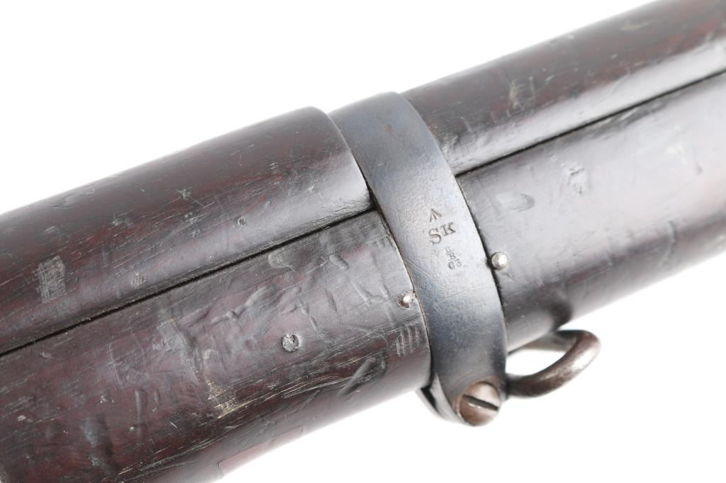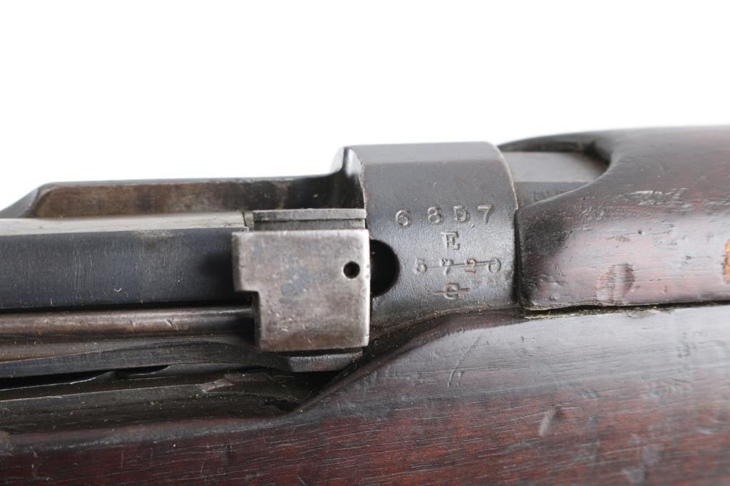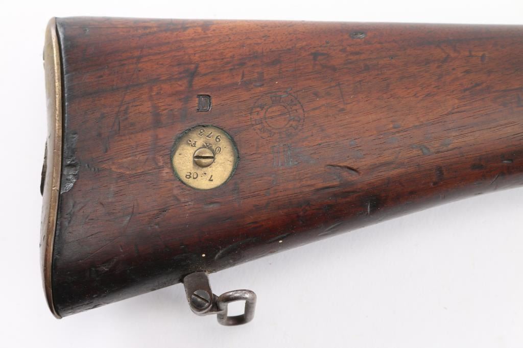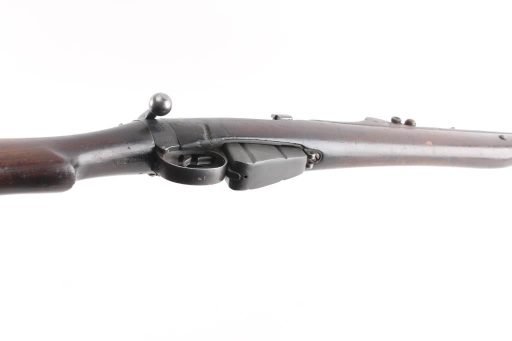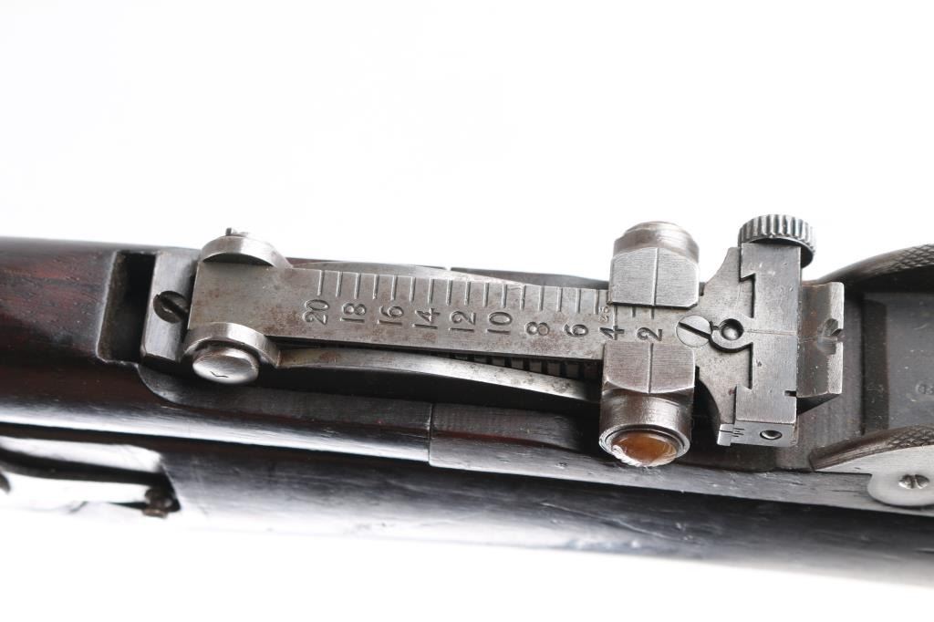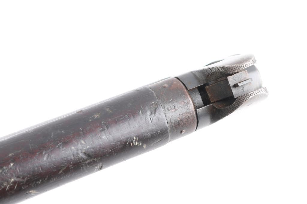 British military single shot bolt action training rifle chambered in .22 caliber rimfire Marked on right stock collar .A.G. PARKER & CO / BIRMINGHAM”.& "22 PATT '14 No 1" . The left side of the stock collar is marked “ENFIELD / 1905 / SHT LE / COND II”. These are markings from the previous Arsenal conversion to a SMLE Condition 2 configuration, 25.2" barrel, raised patridge front sight, leaf style rear sight graduated to 2,000 yards with a 25 yard mark, metal nose cap with protective front sight ears, bayonet lug & piling swivel, serrated trigger, "22" marked hollowed magazine that acts as a brass collector, manual safety on the left side of the receiver, smooth full-length wood handguard & forend and straight grip shoulder stock with brass trapdoor buttplate, brass disc inletted in left butt stock.. Rifle retains approximately 85% of it's dark blue finish showing handling/edge wear. Action is smooth, the bore looks good, srtrong rifling, but needs cleaning. and the wood stocks are good/sound with mant scratches/ding, a couple of gauges, number "5" is painted on the left buttstock. Rare.