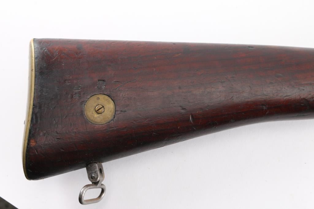 British military single shot bolt action training rifle chambered in .22 caliber rimfire. Marked on right stock collar. A.G. PARKER & CO / BIRMINGHAM” & "22 PATT '14 No 1". The left side of the stock collar is marked “ENFIELD / 1905 / SHT LE / COND II”. These are markings from the previous Arsenal conversion to a SMLE Condition 2 configuration, 25.2" barrel, raised patridge front sight, leaf style rear sight graduated to 2,000 yards with a 25 yard mark, metal nose cap with protective front sight ears, bayonet lug & piling swivel, serrated trigger, "22" marked hollowed magazine that acts as a brass collector, manual safety on the left side of the receiver, smooth full-length wood handguard & forend and straight grip shoulder stock with brass trapdoor buttplate, brass disc inletted in left butt stock, volley sight base in left fore stock. Rifle retains approximately 90% of it's dark blue finish showing handling/edge wear. Action is smooth, the bore is excellent and the wood stocks are very good+. Rare.