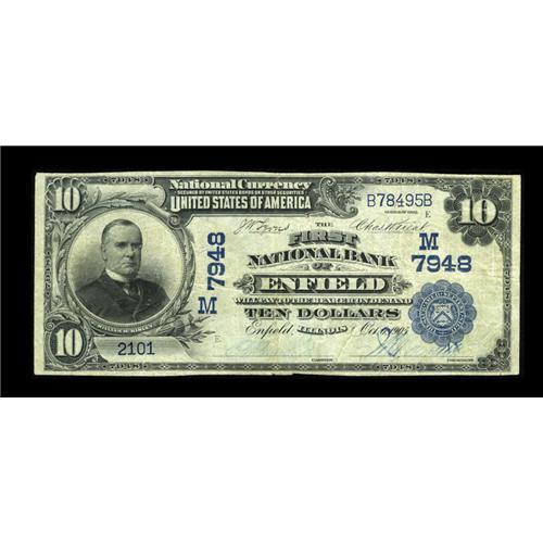 <B>Enfield, IL</B></I> - $10 1902 Date Back Fr. 617 <B>The First NB</B></I> Ch. # (M)7948<BR>October 17, 1905 saw the bank receive its charter and assume the obligations of the Bank of Enfield which commenced operations in this White County locale in 1889. U.B. Barnett's name as president and C.W. Crawford's as cashier grace the note in blue pen. Barnett served as president for a total of 13 years. It has been 14 years since we have seen this piece. <B>Fine.</B></I><BR><I>From The Lincoln Collection</B></I><BR><BR><b>Shipping:</b> Coins & Currency (<a target="_blank" href="http://www.heritageauctions.com/common/shipping.php">view shipping information</a>)