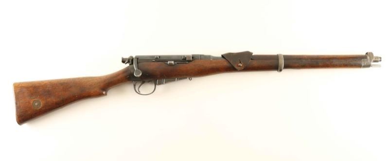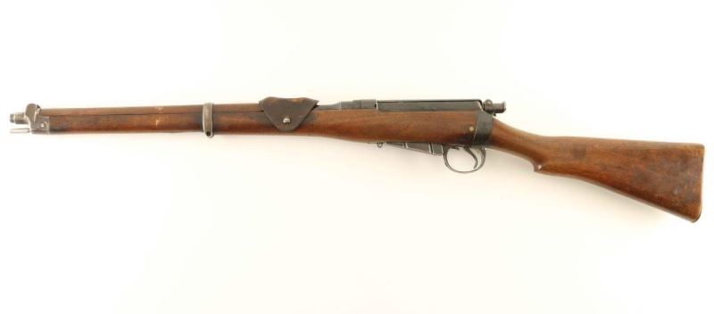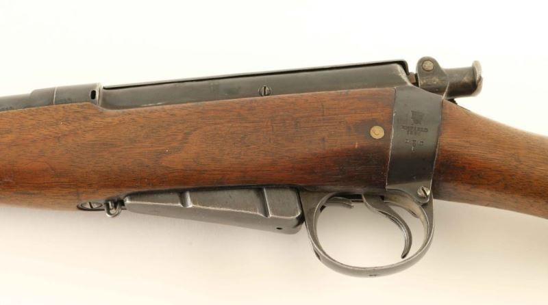 SN:1899 British military magazine fed bolt action service rifle chambered in .303 British. Manufactured circa 1896. Features a blued finish, 20.75" barrel, blade front sight, 'EC' marked rear sight graduated to 2000 yards with leather cover, metal nose cap with integral ears for the front sight, cleaning rod, serrated trigger, detachable 6 round magazine, magazine cut off on the right side of the receiver, dust cover and manual safety on the bolt, smooth wood hand guard, full length forend and straight grip shoulder stock with brass disc & brass trapdoor buttplate. The left side of the butt socket is marked '[crown]/VR/Enfield/1896, L.E.C./I'. Barrel has an 'E' stamped over the chamber. Stock is marked 'M&D' and the Enfield circular cartouche/I/1." Serial numbers are matching on the receiver, barrel, bolt handle and rear sight. Rifle exhibits approximately 90% of its blued finish overall showing light wear. Action is smooth, bore is very good and the wood stock is near fine. Condition is NRA Fine ***Antique Firearm*** From The John F Sukey Collection