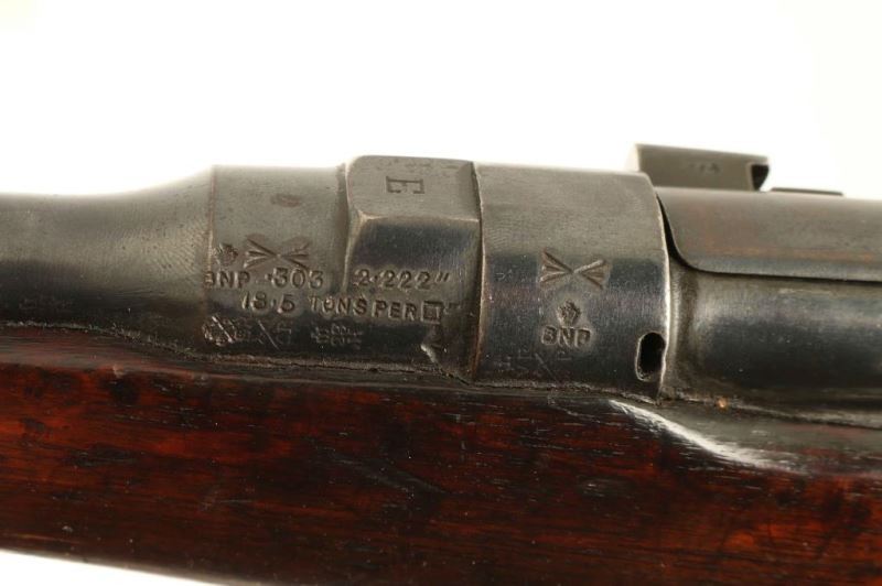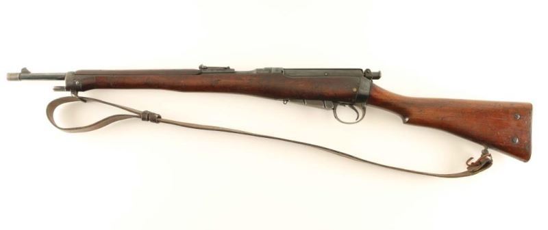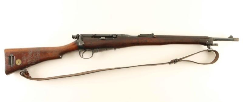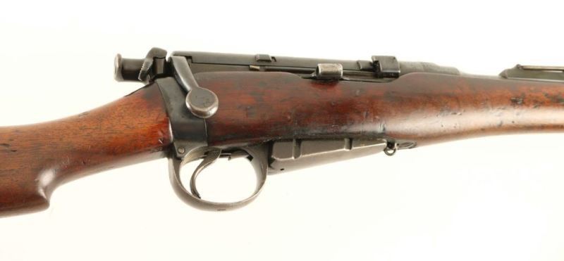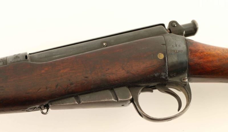 Sn: 1290a British military magazine fed bolt action service rifle converted in 1905 for the Royal Irish Constabulary, utilizing a 1895 production Lee Enfield Carbine chambered in .303 British. Features a blued finish, 20.75" barrel with a collar added for use with an 1888 pattern bayonet, raised blade front sight, graduated to 2000 yards, metal forend tip with bayonet lug and provisions for a cleaning rod, serrated trigger, detachable 6 round magazine with cut-off on the right side of the receiver, dust cover & manual safety on the bolt, brown leather sling, smooth wood hand guard & forend and straight grip shoulder stock with sling bar, brass disc & brass trapdoor buttplate. The left side of the butt socket is marked '[crown]/VR/Enfield/1895/1/L.E.C" and is also stamped 'ENGLAND'. Barrel has an 'E' stamped over the chamber as well as nitro proof marks. Stock has a '1902' dated Birmingham circular cartouche/1 and the brass disc is stamped '3'.04/R.I.C/1875'. Serial numbers are matching on the receiver, barrel and rear sight. Rifle exhibits approximately 70% of its bright blued finish showing honest wear. Action is smooth, bore is excellent and the wood stocks are good+ showing repairs to the hand guard and forend. Condition is NRA Fine ***Antique Firearm*** From The John F Sukey Collection