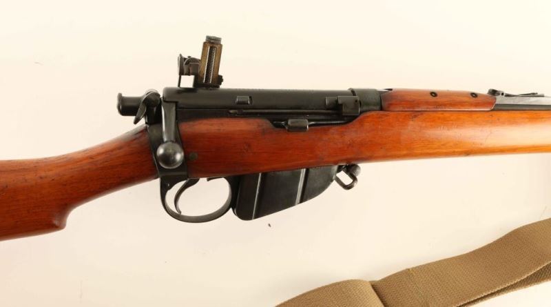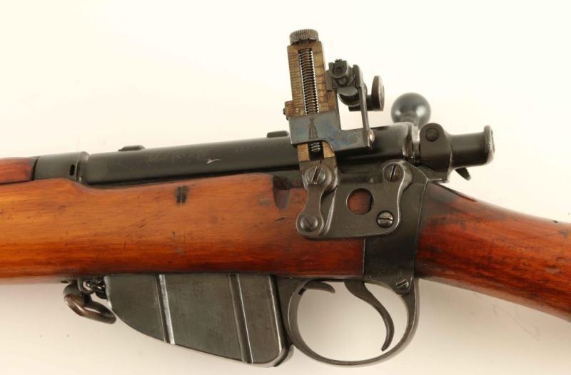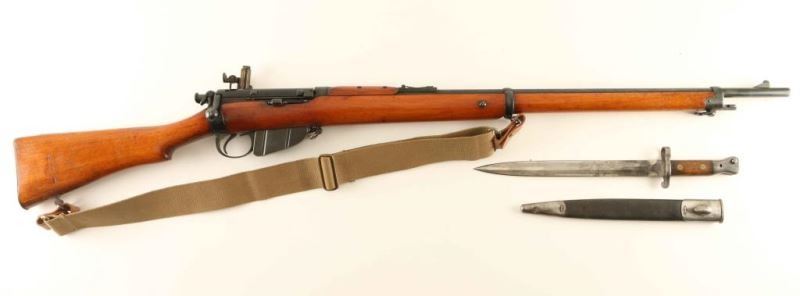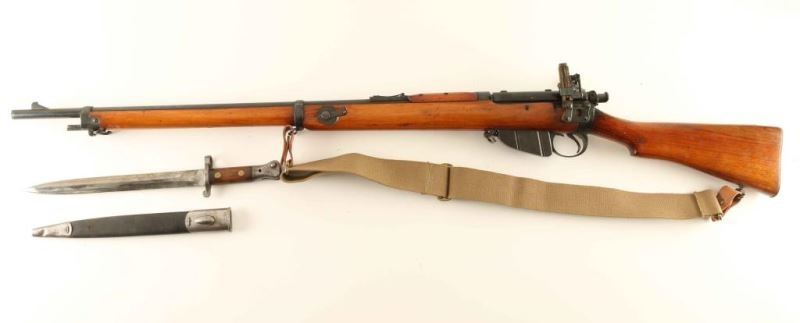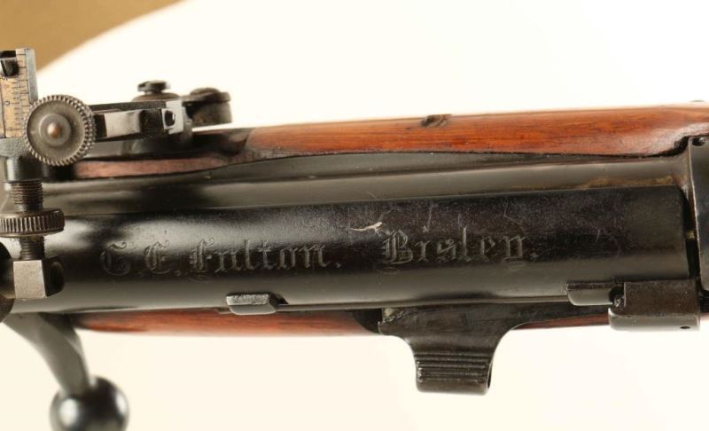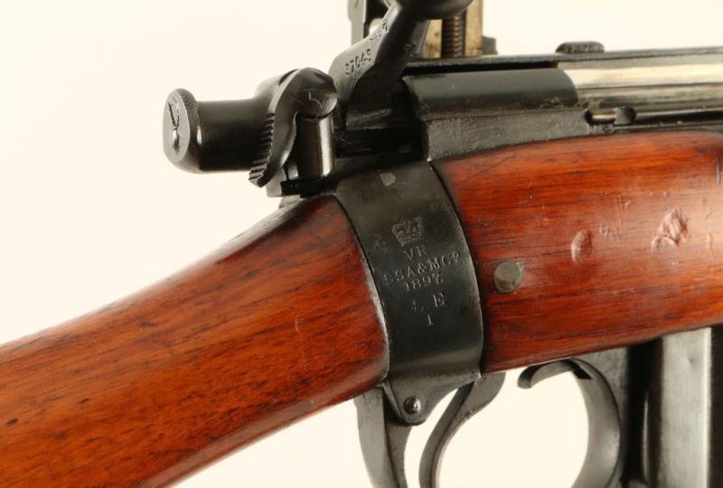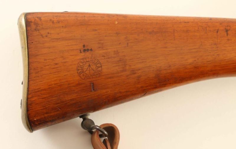 1897 vintage British military magazine fed bolt action rifle that was sold out service and lightly sporterized by G.E. Fulton of Bisley. Features a blued finish, 30.2" barrel, ramped inverted 'v' front sight, removed rear sight leaf, front volley sight, adjustable BSA sight with variable aperture dioper mounted in place of the rear volley sight, metal forend cap with bayonet lug & piling swivel, serrated trigger, detachable magazine linked to the bottom metal, magazine cut off on the right side of the receiver, dust cover & manual safety on the bolt, tan canvas sling, smooth wood hand guard, full length forend, and straight grip shoulder stock with long tang brass trapdoor buttplate. Includes a 1888 pattern bayonet by Wilkinson with scabbard. The right side of the butt socket is marked '[crown]/VR/BSA & M. Co./1897LE/1' and the dust cover is inscribed "G.E. Fulton. Bisley." The top of the barrel & receiver are marked "SALE[crown]PERMIT" and the barrel is also stamped "E" & "*." The stock is marked with a circular cartouche "BIRMINGHAM.1905"/I on the right side and "H.T." in an oval on the left. Serial numbers match on the receiver, barrel and bolt handle. Rifle exhibits approximately 90% of it;s blued finish showing light scattered wear and a small amount of surface rust on the top of the barrel. Action is smooth, the bore is excellent and the wood stocks are near fine. Condition is NRA Excellent ***Antique Firearm*** From The John F Sukey Collection