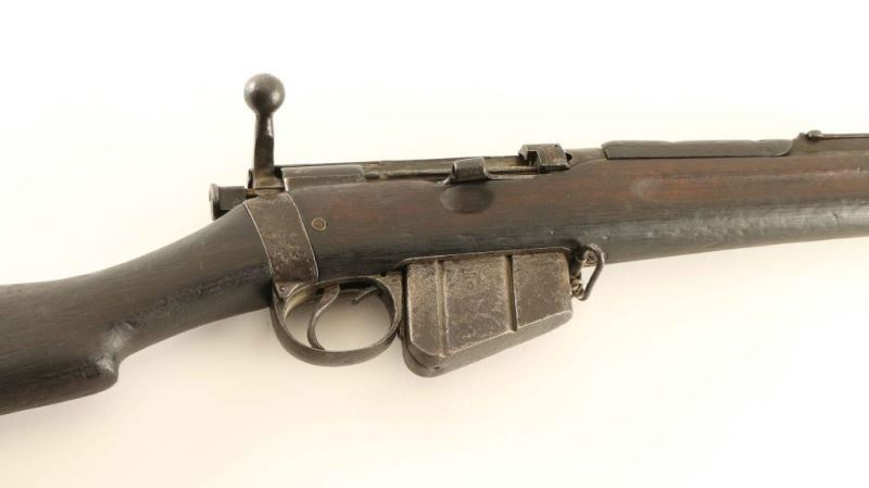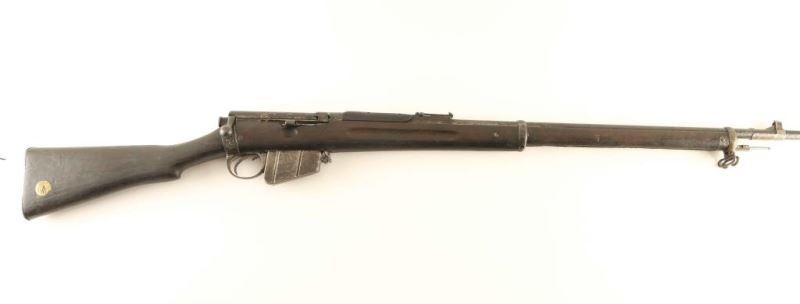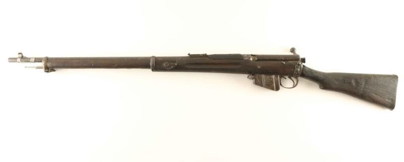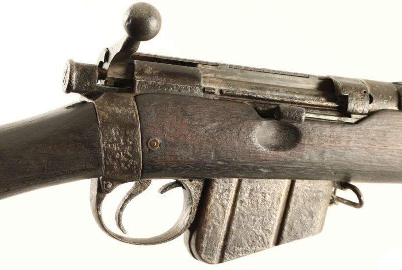SN: 547H British military magazine fed bolt action service rifle chambered in .303 British, manufactured circa 1890's. Features a 30.2" barrel, ramped blade front sight with cover, latter style rear sight graduated to 1800 yards, volley sights, metal forend cap with bayonet lug, piling swivel & improper cleaning rod, serrated trigger, detachable 8 round magazine with cut-off on the right side of the receiver, two-piece dust cover on the bolt, sling swivels, smooth wood hand guard, full length forend with finger grooves, and straight grip shoulder stock with brass disc and trapdoor metal buttplate. The right side of the butt socket is marked '[crown]/VR/Enfield/189?/1*,' the stock disc is marked 'BA/1/1893' and '2 LAN/541'. Serial numbers match on the receiver and barrel. Rifle displays heavy pitting throughout with a dark patina. Action functions well, bore is very good, and the wood stocks are intact showing extensive damage. Condition is NRA Poor ***Antique Firearm*** From The John F Sukey Collection
