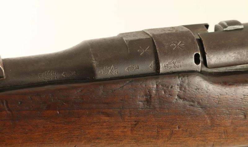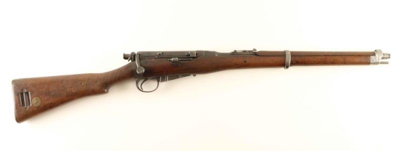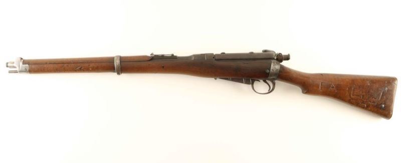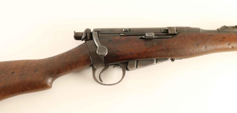SN:5924 British military magazine fed bolt action service rifle chambered in .303 British, manufactured circa 1895. Features a blued finish, 20.75" barrel, blade front sight, ladder style rear sight graduated to 2000 yards, metal nose cap with integral front sight ears, cleaning rod, serrated trigger, detachable 6 round magazine with cut-off on the right side of the receiver, dust cover & manual safety on the bolt, smooth wood hand guard, full length forend and straight grip shoulder stock with brass disk, sling bar & brass trapdoor buttplate containing an oiler. The left side of the butt socket is marked '[crown]/VR/ Enfield/1895/1/51." Serial numbers match on the receiver, barrel, and rear sight. Stock shows an embossed carving on the left side of the butt, as well as 'EA' scratched into the stock and the brass disc is marked "7.99" and '11H/51'. The majority of the metal surfaces display an aged brown patina with some original bluing retained in the protected areas. The dust cover shows light pinprick pitting and the magazine shows some rust. Action is smooth, bore is good with a dark ring approximately 1" from the muzzle, and the wood stocks are good showing scattered dings and small gouges. Condition is NRA Very Good ***Antique Firearm*** From The John F Sukey Collection