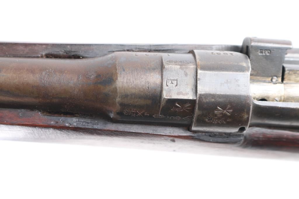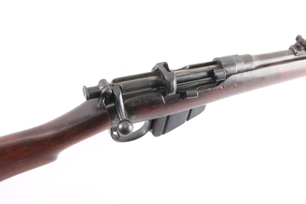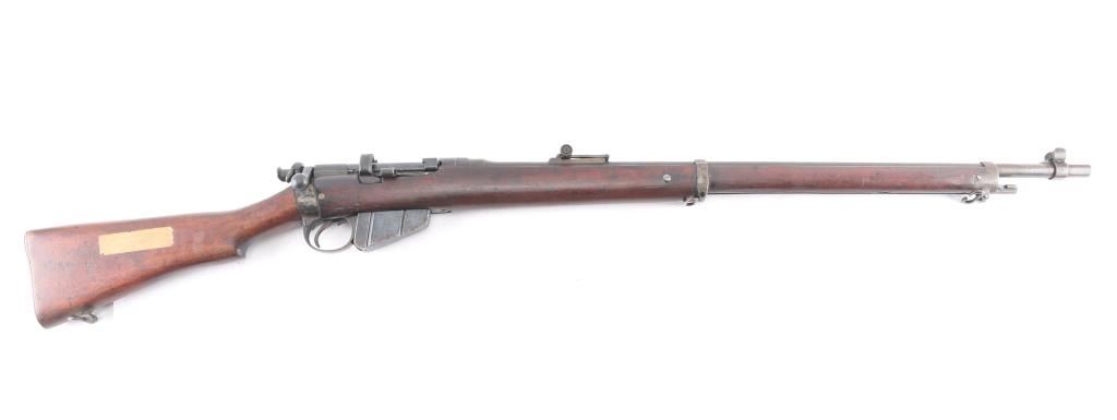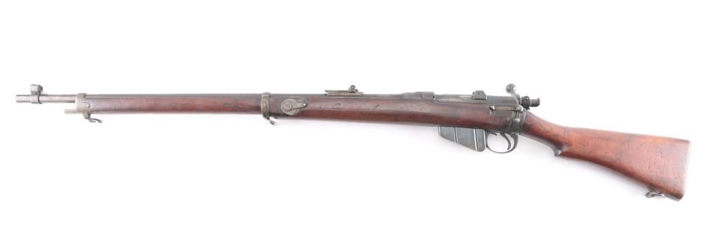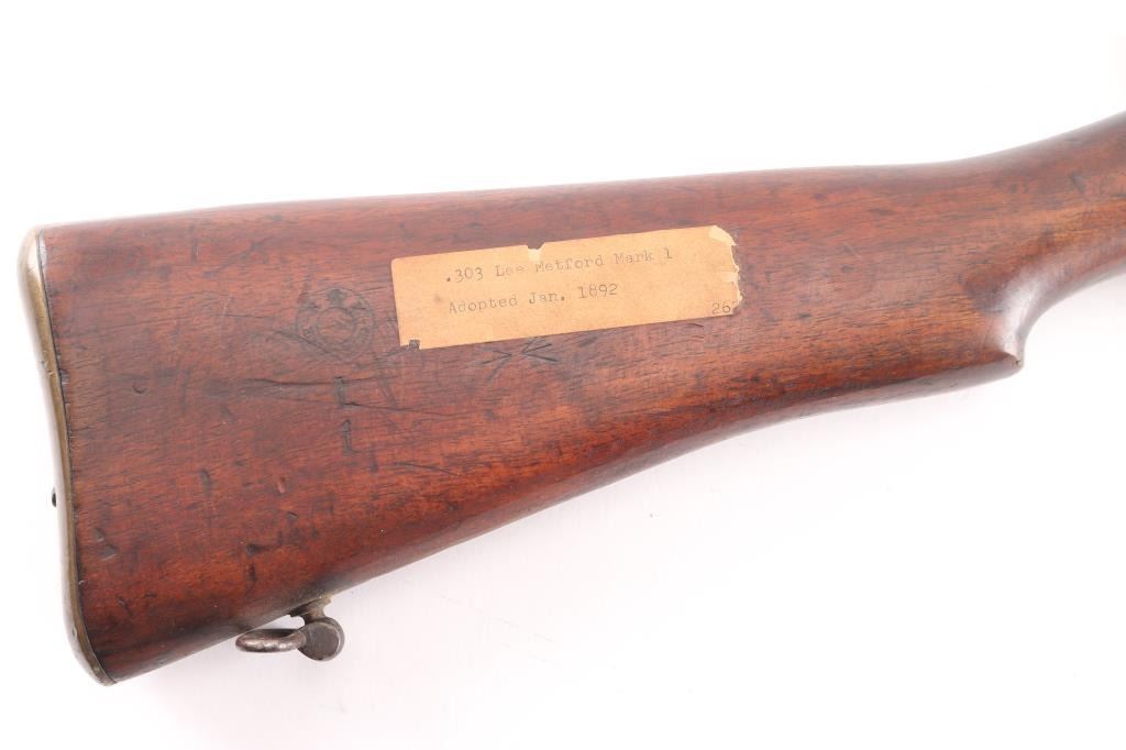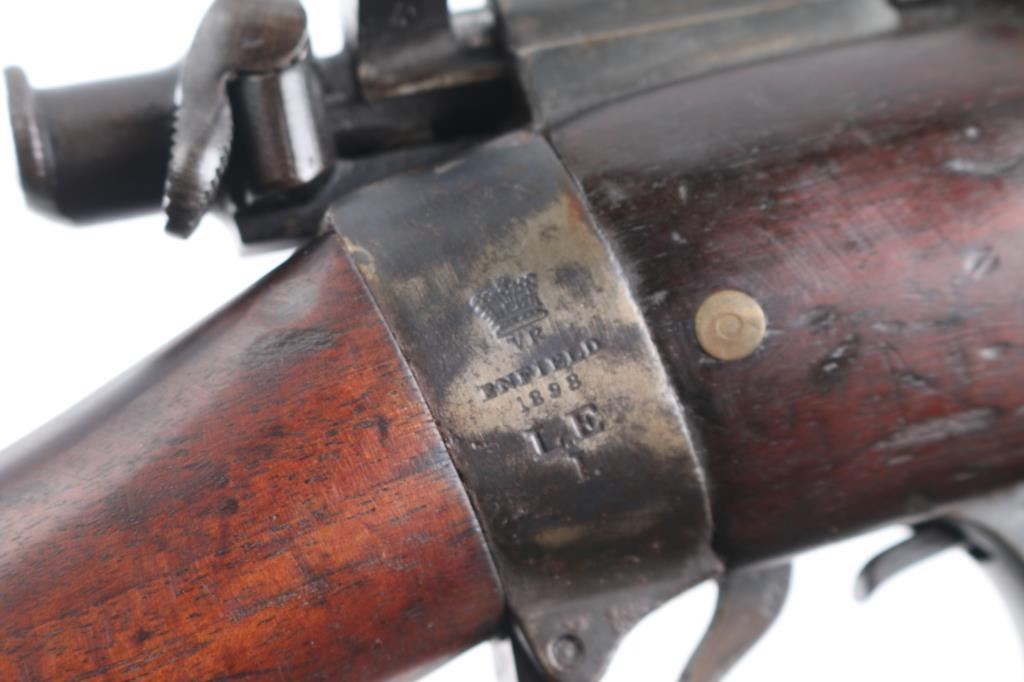 Rare British military magazine fed bolt action service rifle chambered in .303 British. Produced 1894-96. This one manufactured 1896. Features a blued finish, 30.2" barrel, protected ramped blade front sight, ladder type rear sight, volley sights, two barrel bands, front band incorporating bayonet lug,sling swivel missing cleaning rod, serrated trigger, detachable magazine, magazine cut off on the right side of the receiver, dust cover and manual safety on the bolt, bridge on receiver for stripper clip loading, smooth wood hand guard, full length forend, and straight grip shoulder stock with brass trapdoor buttplate. The right side of the butt socket is marked '[crown]/VR/Enfield/18949/LE/I' and the buttplate is marked "broad arrow/EFD/63'. The barrel is marked 'E' over the chamber,British proofs. Rifle retains a nice blued finish on the receiver while the rest of the rifle displays a mostly brown patina with some blue on the bolt, receiver, and magazine, scattered light pin-prick pitting. Action is smooth, bore is very good/bright, good rifling, and the wood stock is good with many blemishes. Matching serial number on receiver, barrel, mismatched bolt. Right butt stock has an Enfield cartouche with "L" "I" under it. There is an old label, turned brown with age, typed, ".303 Lee Metford Mark I Adopted Jan. 1892." No import marks.