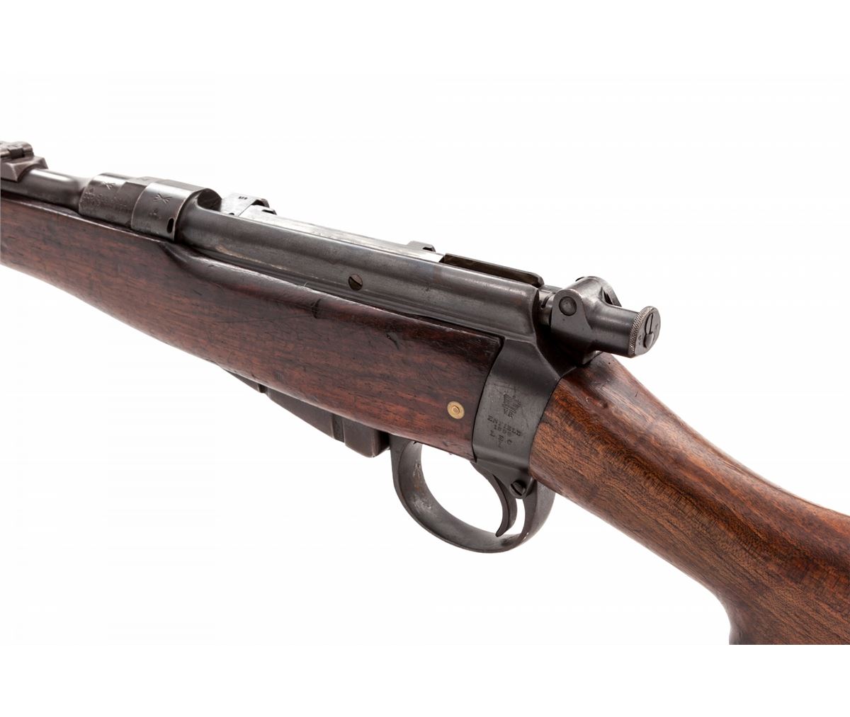 Enfield MK I Royal Irish Constabulary Carbine, #5655, .303 cal., 20-1/2'' barrel, blue finish, walnut stock and handguard, with correct bayonet and nickel-plated scabbard. Original five-round magazine is retained with single shot cutoff; receiver ring marked ''(crown)/V.R./Enfield 1898/L.E.C.-I''. Stock disc marked ''RIC/4364'' with crisp Enfield cartouche. Condition is fine retaining approx. 92% thinning and toning blue. Stock with light scuffs, scratches, and some oil darkening. Chamber area with full complement of English proofmarks. Action is good, bore is fine. Est.: $750-$1,000. (Antique)