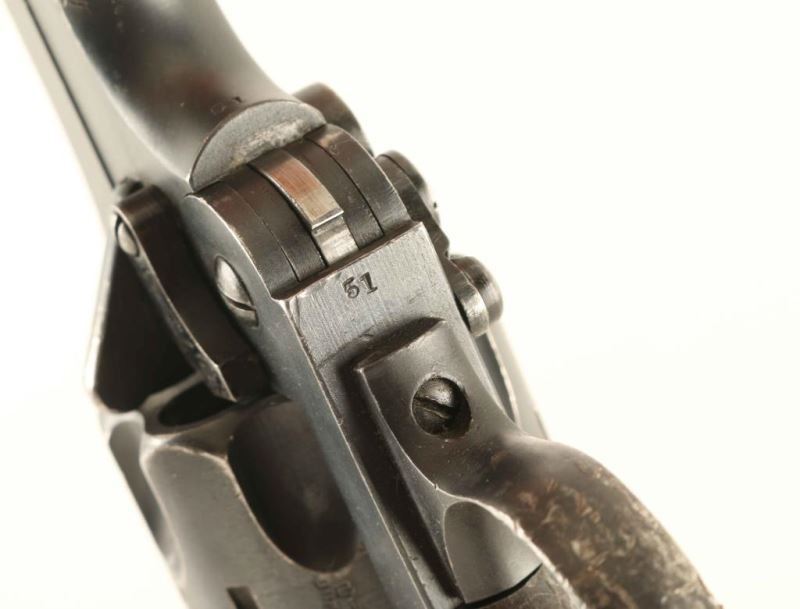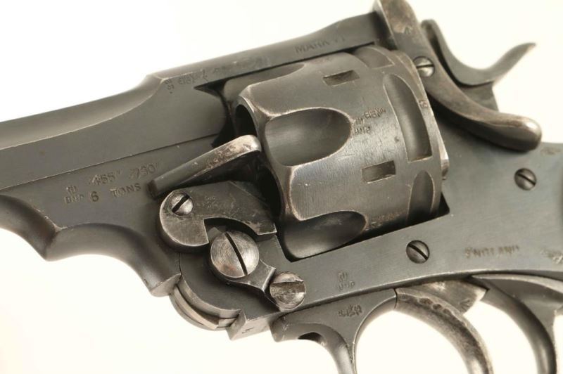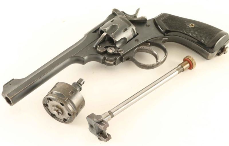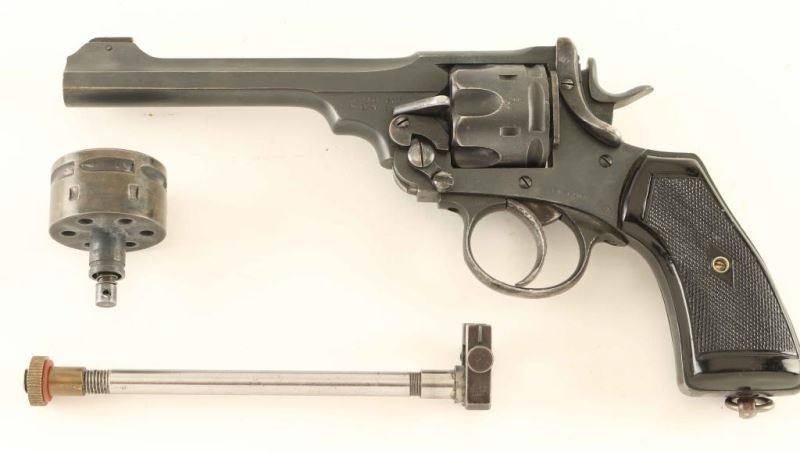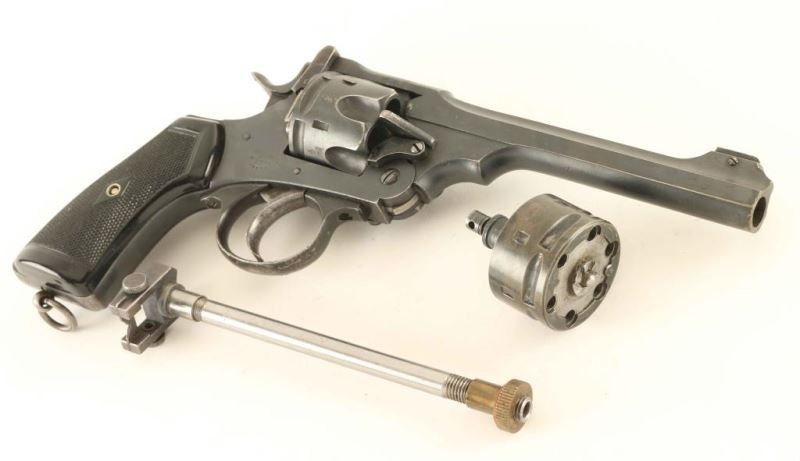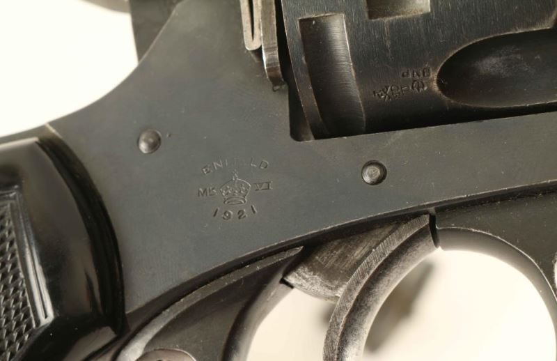 British military top-break double action Webley pattern revolver chambered for .455, produced by the Royal Small Arms Factory circa 1921. Features a blued finish, 6" barrel, patridge front sight, notched rear sight on the barrel catch, 'shaved' six shot cylinder that measures 1.450" long, square-butt frame with lanyard ring, and two-piece diamond checkered hard rubber grips. The serial numbers match on the frame, barrel and cylinder. Markings: Frame - "ENFIELD/Mk[crown]VI/1921," military proofs & "ENGLAND" Barrel - ".22," "MARK VI," military proofs and English proof house marks. Includes a Parker-Hale/Bisley Works marked .22 caliber conversion unit. Revolver retains approximately 90% of it's fine blued finish overall showing holster wear and heavy finish loss on the backstrap & trigger guard. Action is sound with very good lock-up, bore is excellent, markings are good and the hard rubber grips are very good but are slightly small in comparison to the frame. Condition is NRA Very Good. ***C&R Firearm*** From The John F Sukey Collection
