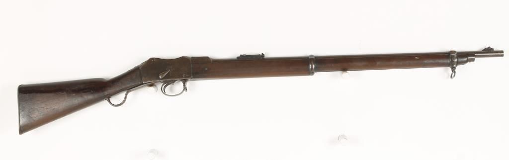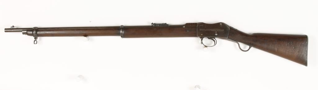 Early Martini converted to .22 caliber early 1900's, with 29-1/2" barrel. Side of receiver marked "Converted by C.G. Bonehill of Birmingham for the Society of Miniature Rifle Clubs". Very small post front sight with graduated rear sight. Maintains original wood and bayonet lug. Dark bore and good action. Condition: Fair to good showing a few small pockets of light pitting. Metal turning to dark patina, wood is fair to good. *Curio & Relic Firearm*