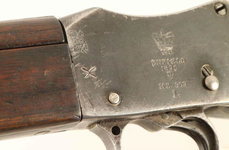 Converted British military lever-operated breech loading single shot service rifle chambered for the .303 British, manufactured circa 1878 with an 1896 dated conversion. Features a blued finish with a 30 1/4" barrel, raised blade front sight, graduated rear sight, two barrel bands, metal forend cap, serrated trigger, short lever, cocked indicator, smooth wood handguard full length forend, and straight grip shoulder stock with brass disc and metal buttplate. Includes a bayonet and scabbard. Marked '[crown]/VR, Enfield/1879, III/1/2' on the right side of the receiver, [crown]/VR, Enfield/1896, and M.E.303/I. on the left side of the receiver. 'VIC-COB inside a circle, Enfield circular cartouche/I/1 and 1005' on the stock. Rifle exhibits approximately 20% of its thin blue finish overall showing scattered pinprick pitting. The action functions well, bore is dark with good rifling and the wood stock is good with blemishes and a 2" splinter along side the cleaning rod channel. Condition is NRA Fair to Good ***Antique Firearm*** From The John F Sukey Collection