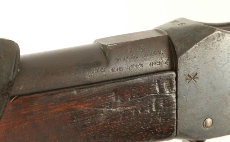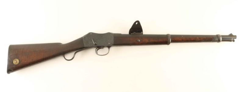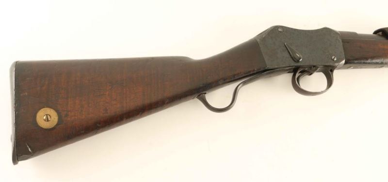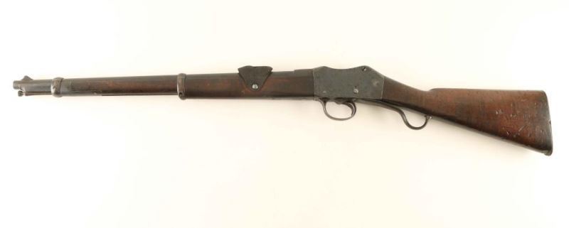 'Interchangeable Carbine 1' Antique British military lever-operated breech loading single shot service rifle chambered for the .577-450 Martini-Henry cartridge. Manufactured circa 1878. Features a blued finish, 21.25" barrel, military style front sight, tangent rear sight graduated to 1000 yards with leather cover, two barrel bands, metal forend cap, cleaning rod, serrated trigger, cocked indicator, full-length smooth wood forend and straight grip shoulder stock with smooth metal buttplate and brass disc. Receiver is marked '[crown]/VR', Enfield/1878, I.C.1, and SX', barrel shows Birmingham proofs and several military proofs and the stock is marked with 'D.P.' & 'R[crown]M-Enfield/1' circular cartouche and the metal piece on the underside of the forend is stamped '305' and 'V1/VC'. Rifle exhibits approximately 40% of its old reblued finish showing scattered surface rust/pitting. Action performs well, bore is excellent and wood stocks are good showing numerous blemishes and a couple small losses. Condition is NRA Good ***Antique Firearm*** From The John F Sukey Collection
