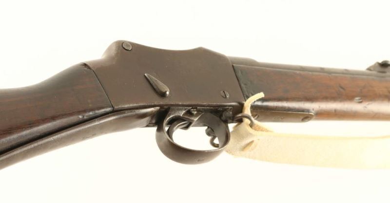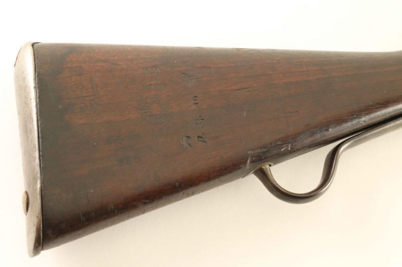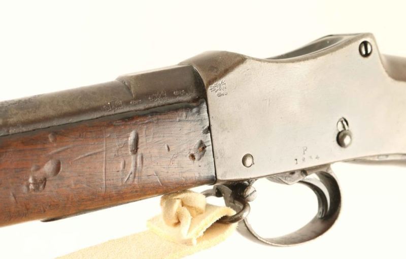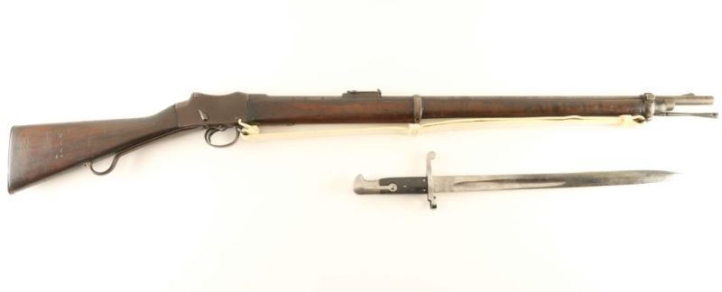 SN:B1234 marked British military lever-operated breech loading single shot service rifle chambered for the .577-450 Martini-Henry cartridge, manufactured circa 1887. Features a blued finish with a 33" barrel, ramped blade front sight, graduated rear sight, two barrel bands with bayonet lug on front band, metal forend cap, cleaning rod, serrated trigger, cocked indicator, long lever, white leather sling, full length smooth wood forend and straight grip shoulder stock with metal buttplate. Includes 1887 pattern bayonet. Receiver is marked '[crown]/VR, Enfield/1887, IV/1, P/134'. Shoulder stock is marked with Nepalese characters, 'RAWUL PINDI' round cartouche with 1908 date and the metal buttplate is marked with '701966764'. Receiver displays an aged brown patina while the barrel shows a mostly grey patina with scattered dark rust. Action is mechanically sound, bore is very good and the wood stock is very good with many dings and some small losses. Condition is NRA Fair to Good ***Antique Firearm*** From The John F Sukey Collection