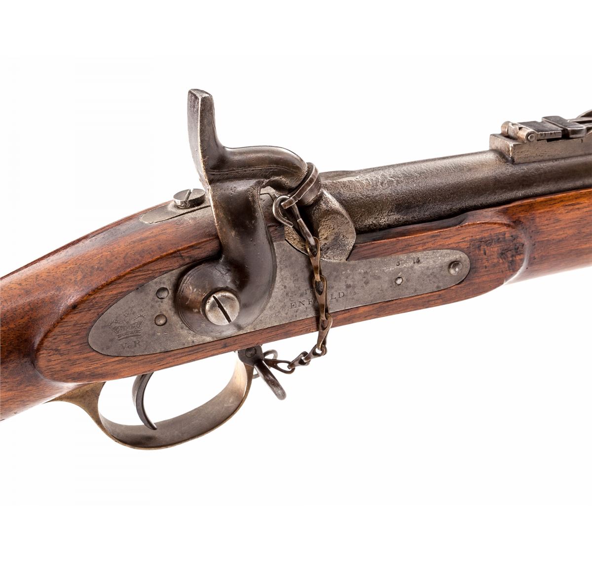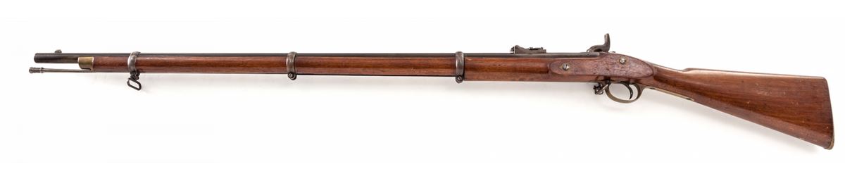 Enfield Model 1853 Rifled Musket, NVSN, .577 cal., 39'' barrel, lockplate marked ''(crown)/VR-1864/Enfield'', walnut stock with Enfield cartouche, brass triggerguard and buttplate, upper tang (marked ''10R.R./225''), with standard mid-production features and three steel bands, nipple cover and ramrod. Condition is fine with brown toned barrel and light to moderate erosion near nipple bolster. Stock with light dings and scuffs and possible coat of additional varnish. Action and bore are good. Est.: $1,200-$1,800. (Antique)